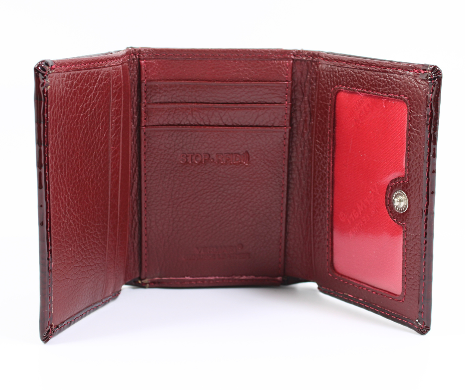 Niewielkich rozmarów damski portfel marki VerMari to esencja stylu i funkcjonalności. Wykonany ze skóry w kolorze ciemnej czerwieni. Lakierowana powierzchnia dodaje elegancji i sprawia, że wyróżnia się spośród innych portfeli na rynku.
