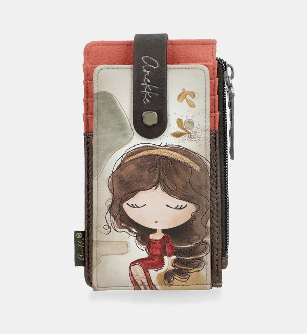 Praktyczne etui na karty Anekke Muse SS26, wykonane z ekologicznej skóry. Etui posiada dwie przegródki: przednią komorę otwieraną za pomocą zakładki, w której znajduje się miejsce na karty, oraz górną komorę zapinaną na zamek na monety i dokumenty. Wnętrze wyściełane jest drukowaną tkaniną