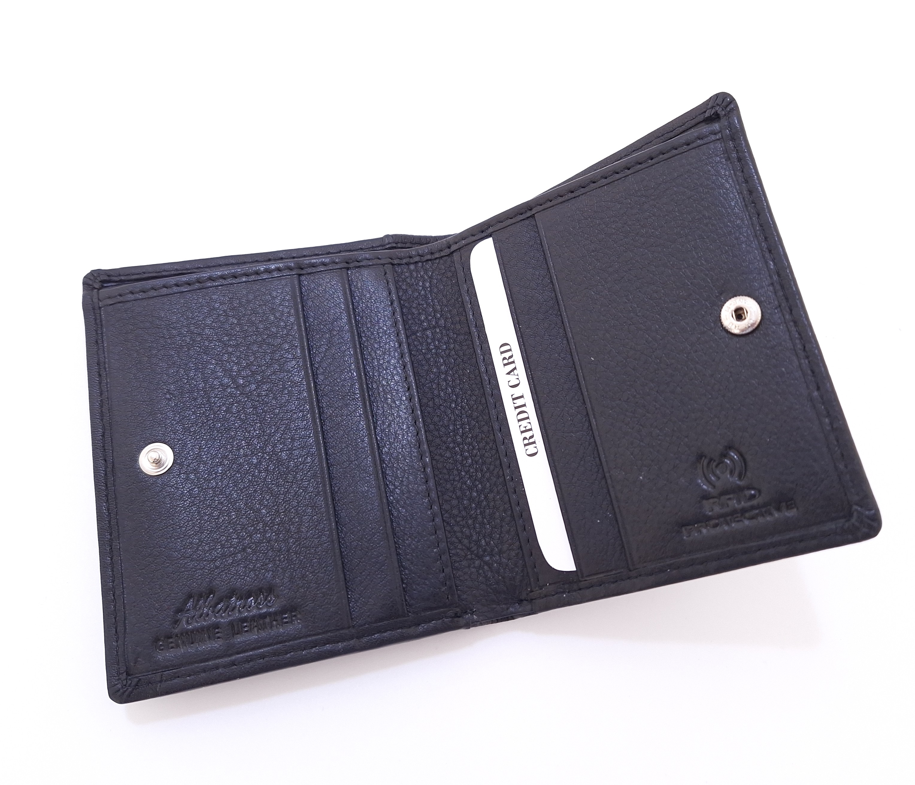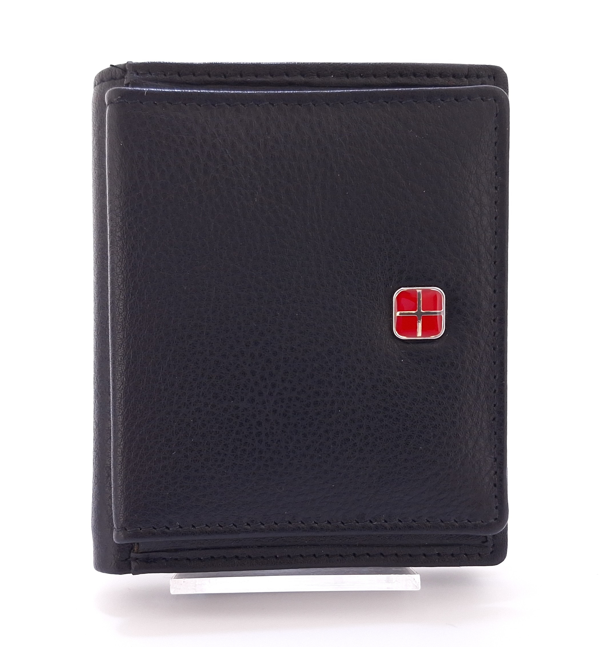 - Średniej wielkości czarny męski portfel wykonany z naturalnej skóry. Posiada kieszonki na karty i banknoty. Wyposażony w system ochrony kart RFID.