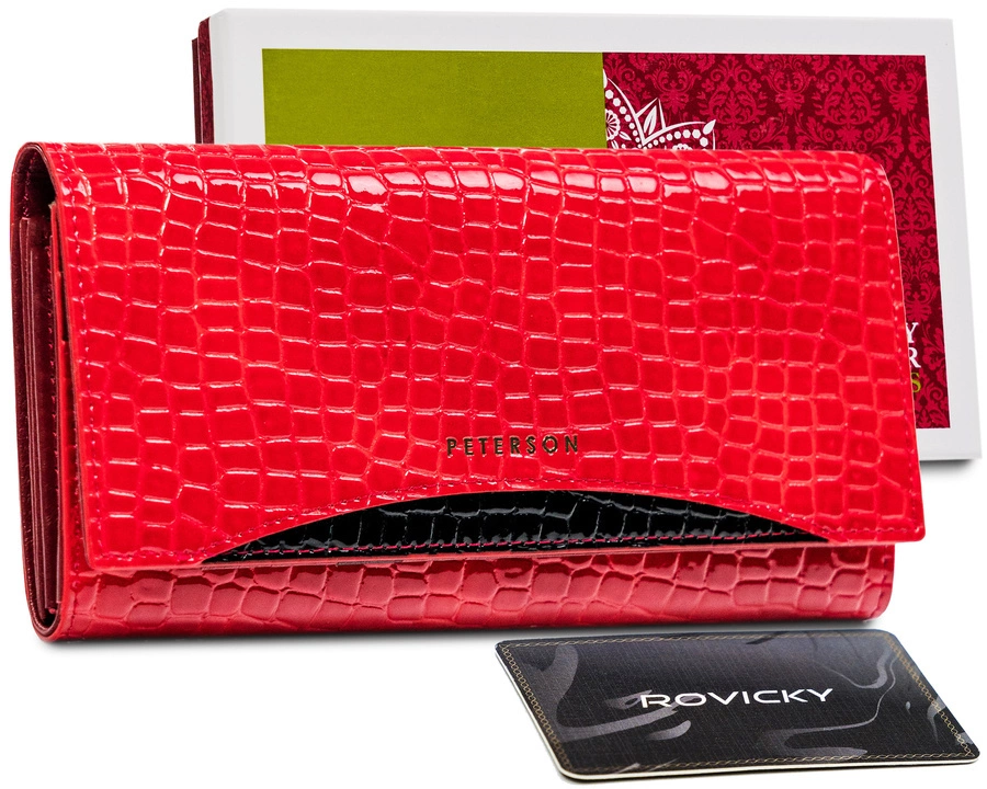 Skórzany portfel damski Peterson odszyty jest ze skóry lakierowanej o fakturze croco. Prezentowany model zamykany jest klapką na zatrzask. Duża ilość przegródek i kieszeni zapewnia miejsce do przechowywania kart, banknotów, monet, ale również innych potrzebnych dokumentów. Dodatkowo portfel wyposażony w technologię RFID, która zabezpiecza Twoje karty, dokumenty biometryczne, legitymacje, karty zbliżeniowe przed nieautoryzowanym odczytem danych.