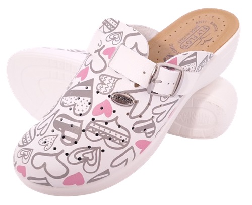 Oryginalne i niezwykle wygodne damskie klapki marki Fly Flot to idealne rozwiązanie dla kobiet, które cenią sobie nie tylko styl, ale przede wszystkim komfort. Wykonane z materiału Evopell , który cechuje się wytrzymałością, trwałością i miękkością. Cholewka ażurowa w kolorze białym ozdobiona jest uroczymi różowo-szarymi serduszkami różnej wielkości, dodającymi delikatności i uroku. Obuwie często wykorzystywane przez służbę zdrowia, takich jak lekarki czy pielęgniarki, ponieważ zapewniają one wyjątkowy komfort nawet podczas całodniowego noszenia. Podeszwa w kształcie delikatnej koturny jest nie tylko lekka, ale także doskonale modeluje sylwetkę, zapewniając stabilność i wygodę na każdym kroku. Zastosowany system anti-shock redukuje wstrząsy powstałe podczas chodzenia, co ma pozytywny wpływ na kręgosłup i stawy. Anatomiczna, miękka wkładka zapewnia większą stabilność, zwiększając powierzchnię nośną. Pasek z klamerką umieszczony na cholewce pozwala dopasować obuwie do tęgości stopy.