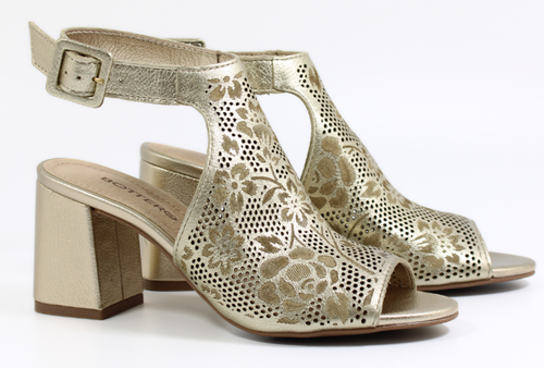 Złote sandały na obcasie z kunsztownym ażurem i złotymi przeszyciami w kwiatowy wzór to kwintesencja kobiecego wdzięku i stylu. Wykonane z wysokiej jakości skóry naturalnej, sandały nie tylko zachwycają swoim wyglądem, ale również zapewniają niezrównany komfort. Ażurowa konstrukcja cholewki zapewnia odpowiednią wentylację, co sprawia, że sandały są przewiewne i doskonale nadają się na ciepłe dni. Miękka wkładka ze skóry ekologicznej zapewnia wygodę podczas każdego kroku. Model oparty na delikatnej podeszwie o wysokości 0,5 cm oraz na eleganckim słupku mierzącym 8 cm. Obuwie wyposarzono w wygodne zapięcie w postaci klamerki zapinającej pasek oplatający nogę wokół kostki. Odsłonięte palce pozwolą Ci poczuć ulgę w ciepłe letnie dni. Wysokogatunkowa podeszwa zapewnia doskonałą przyczepność i amortyzację.