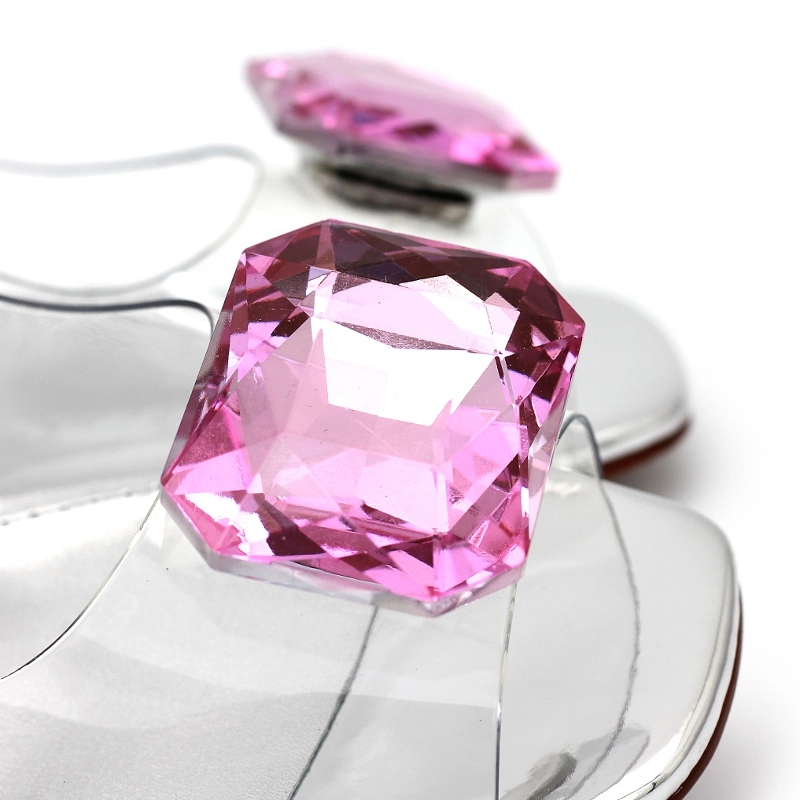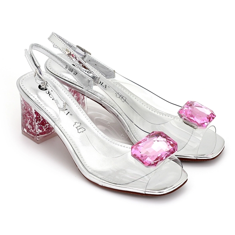 Sandały damskie na obcasie marki Scaviola wykonane z transparentnego silikonu, charakteryzującego się bardzo dużą elastycznością i miękkością. Przednia część butów przyozdobiona szklanym kryształem w kolorze różowym dodającym każdej stylizacji nuty luksusu Sandały posiadają szerszy, przezroczysty obcas, którego środek ozdabiają drobne, różowe drobinki. Klasyczne regulowane zapięcie na sprzączkę zapewnia komfort noszenia i doskonałe dopasowanie.