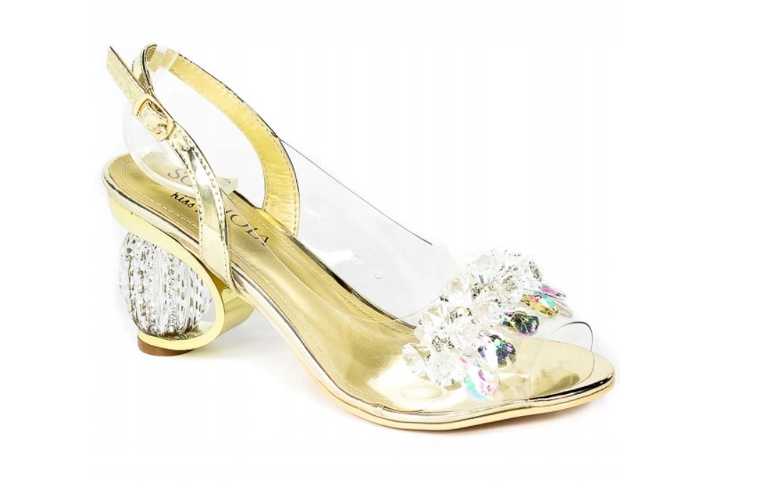 Cholewka składa się z przezroczystego silikonu na przodzie i ozdobionych cyrkonii oraz przezroczystych zdobień.Obuwie posiada profilowaną, miękką, wkładkę.Sandały zapinane na sprzączkę.Model posiada zdobiony cyrkoniami obcas.