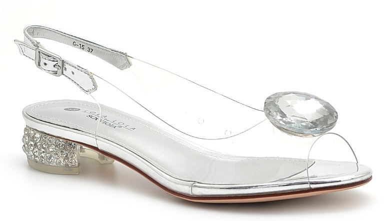 Cholewka składa się z przezroczystej cholewki na czubku ozdobionej dużym, srebrnym kamieniem. Obuwie posiada miękką, wkładkę w kolorze srebra. Buty zapinane na sprzączkę. Model posiada 3 cm obcas typu klocek, transparentny ozdobiony kamieniami.