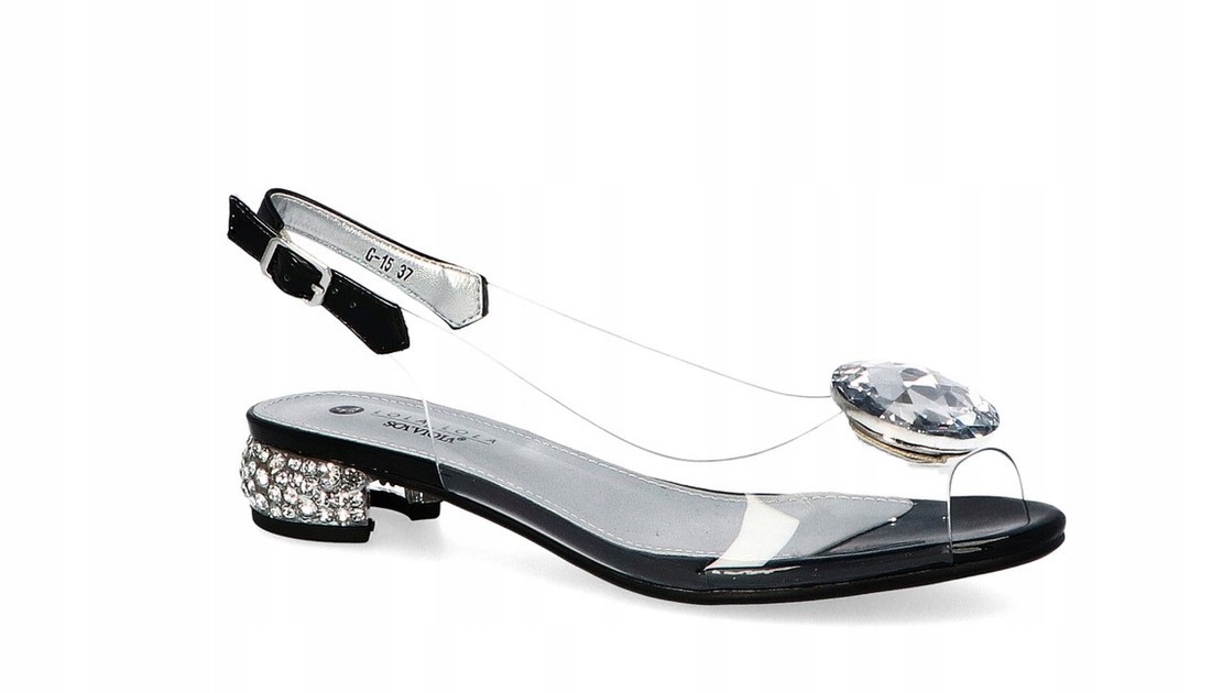 Cholewka składa się z przezroczystego silikonu na przodzie ozdobionej dużym, srebrnym kamieniem. Obuwie posiada profilowaną, miękką, wkładkę. Buty zapinane na sprzączkę. Półokrągły obcas jest cały wysadzany migoczącymi kryształkami. Sandałki mają odsłonięte palce i pięty, dodatkowo od wewnętrznej strony znajdują się dwa małe okrągłe otwory poprawiające cyrkulację powietrza.