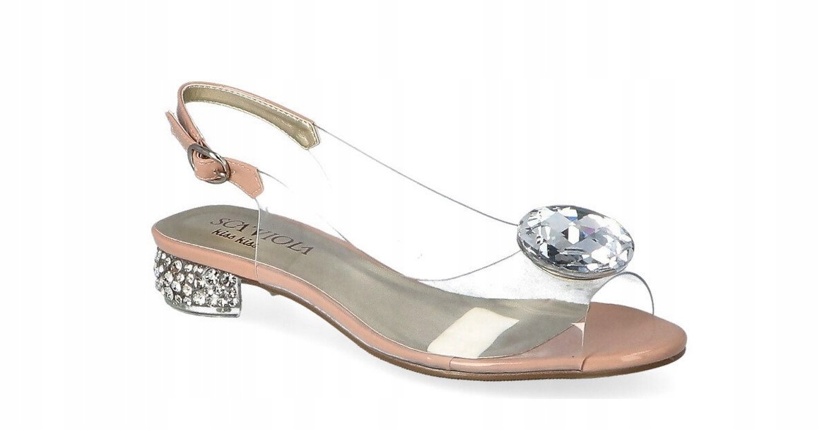 Cholewka składa się z przezroczystego silikonu na przodzie ozdobionej dużym, srebrnym kamieniem. Obuwie posiada profilowaną, miękką, wkładkę. Buty zapinane na sprzączkę. Półokrągły obcas jest cały wysadzany migoczącymi kryształkami. Sandałki mają odsłonięte palce i pięty, dodatkowo od wewnętrznej strony znajdują się dwa małe okrągłe otwory poprawiające cyrkulację powietrza.