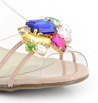 Cholewka składa się z przezroczystego silikonu na przodzie ozdobionej dużym, srebrnym kamieniem. Obuwie posiada profilowaną, miękką, wkładkę. Buty zapinane na sprzączkę. Półokrągły obcas jest cały wysadzany migoczącymi kryształkami. Sandałki mają odsłonięte palce i pięty, dodatkowo od wewnętrznej strony znajdują się dwa małe okrągłe otwory poprawiające cyrkulację powietrza.