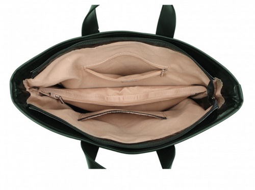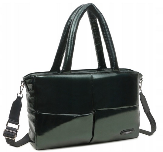 Praktyczna i pojemna torba damska marki Luigisanto o prostokątnym kształcie.Wykonana została z połyskującego, syntetycznego materiału ze starannie wykonanym pikowaniem w kolorze ciemnej zieleni oraz posiada okucia w kolorze srebrnym. Jest pojemna i bez trudu pomieści format A4. Torebka posiada długie rączki, dzięki czemu możesz ją wygodnie nosić w ręku i na ramieniu. W zestawie posiada również długi i regulowany pasek, dzięki czemu można ją nosić na wiele sposobów. Torebka zamykana jest na suwak, a środek wykończony jest solidną podszewką. W środku zasuwana przegroda oraz dwie kieszonki – zamykana i bez zapięcia. Przód torebki zdobi subtelne logo marki.