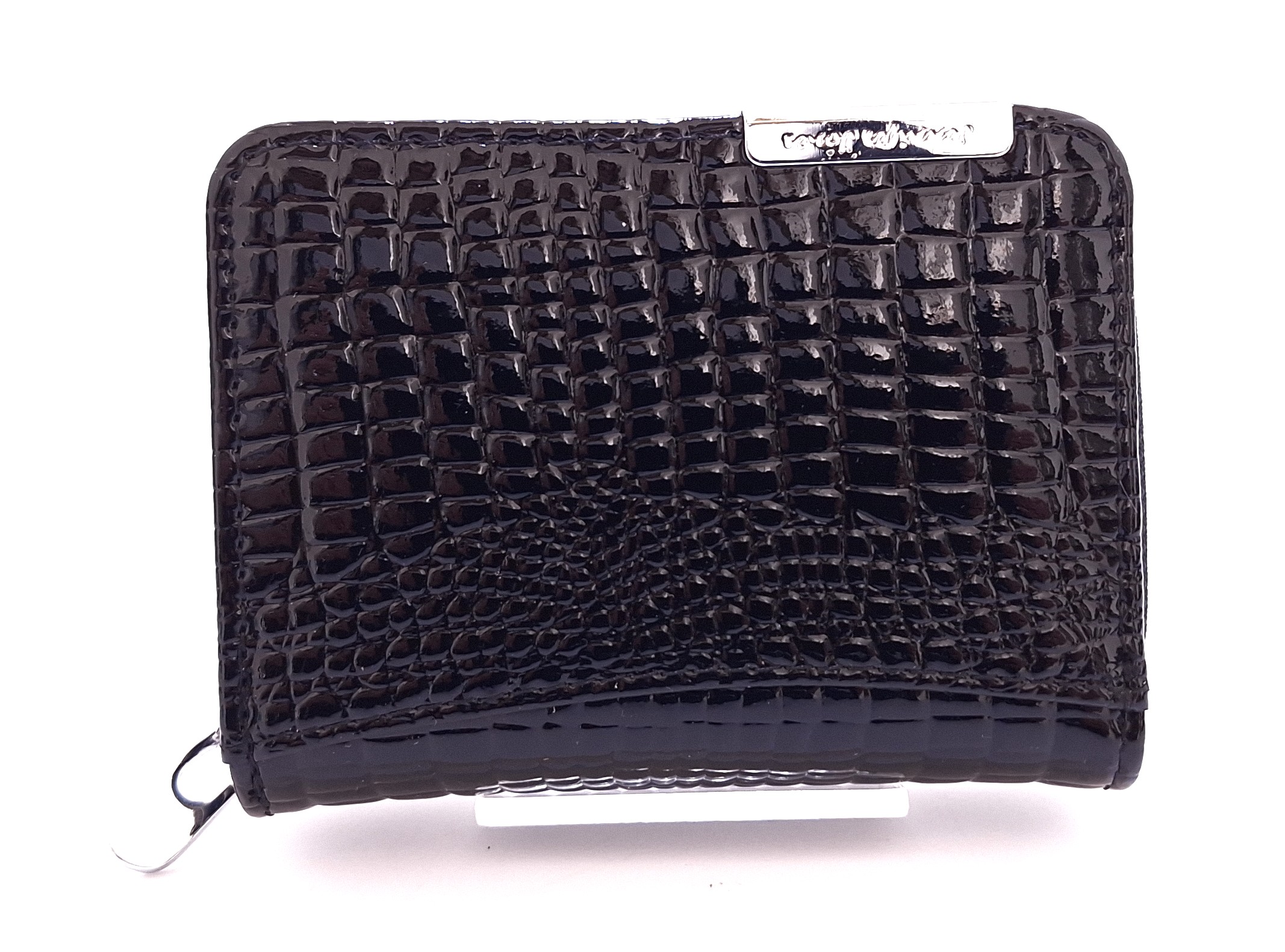 - Czarny małej wielkości damski portfel wykonany ze skóry naturalnej o lakierowanym wykończeniu. Wyposażony liczne przegródki i kieszeń na drobne monety.