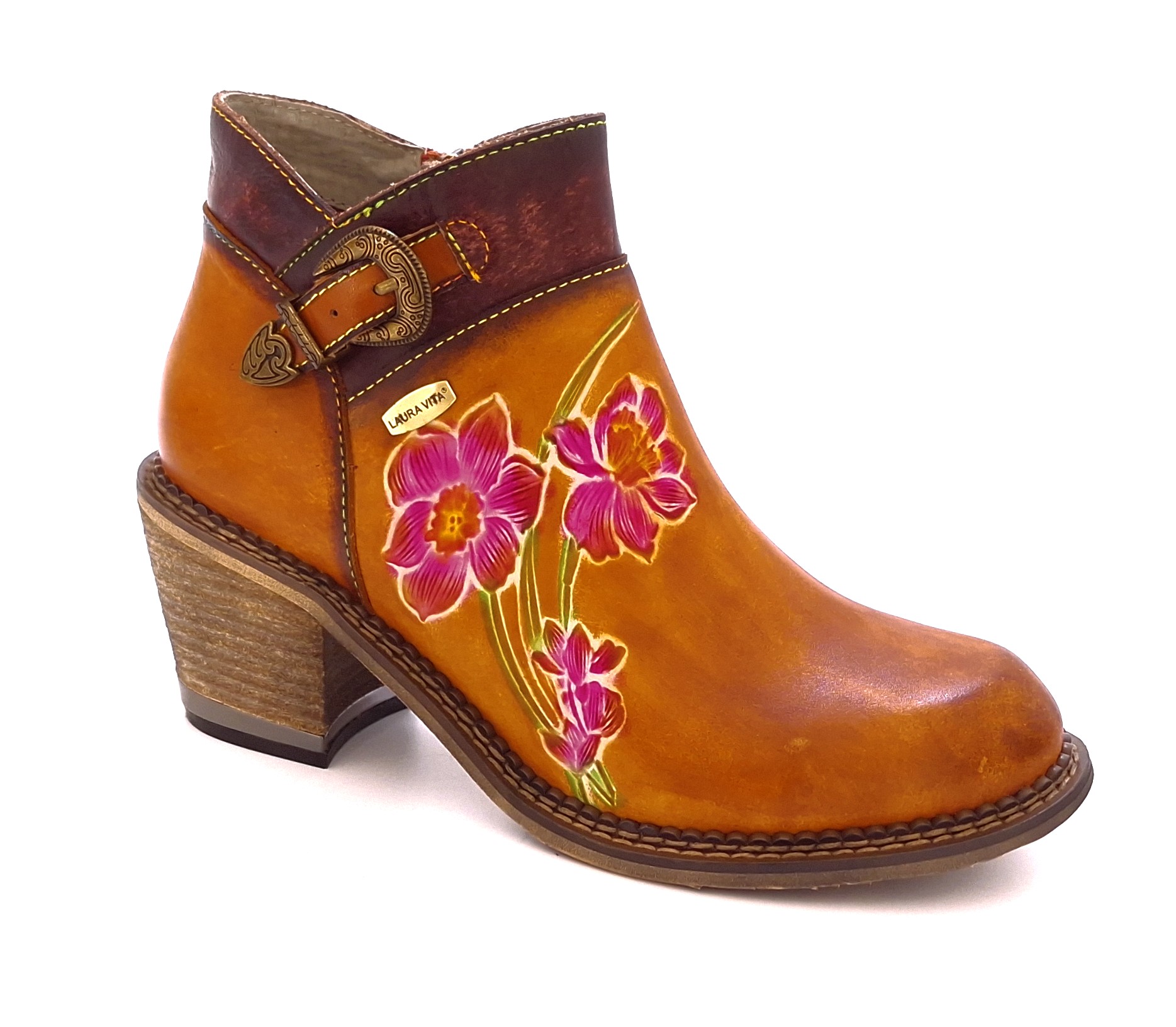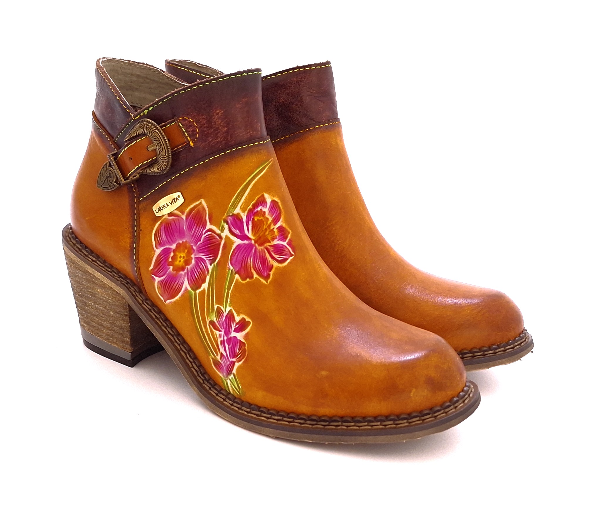 Podkreśl swój niepowtarzalny styl z damskimi botkami francuskiej marki Laura Vita. Wykonane z wysokiej jakości naturalnej skóry licowej. Model inspirowany klimatem boho i western wyróżnia się ręcznie tłoczonym kwiatowym wzorem oraz subtelnym cieniowaniem w odcieniach brązu, które nadają butom głębi i elegancji. Ozdobna metalowa klamra z grawerem dodaje całości oryginalnego, artystycznego akcentu. Model osadzony na szerokim, niezbyt wysokim obcasie w stylu kowbojskim, który gwarantuje komfort noszenia przez cały dzień. Zamek błyskawiczny ułatwia zakładanie i zdejmowanie butów.