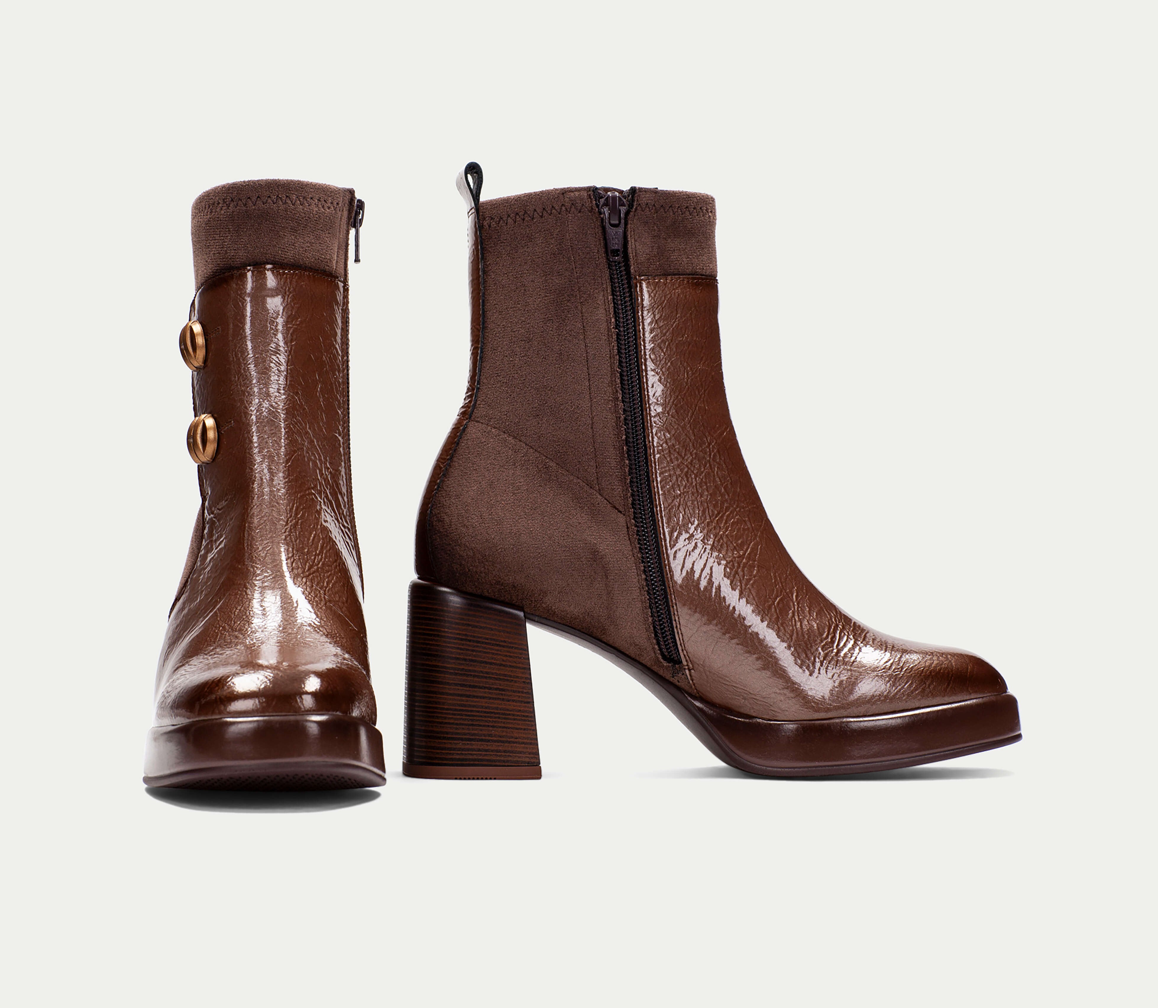 - botki wykonano z połączenia naturalnej skóry lakierowanej z materiałem stretchowym.