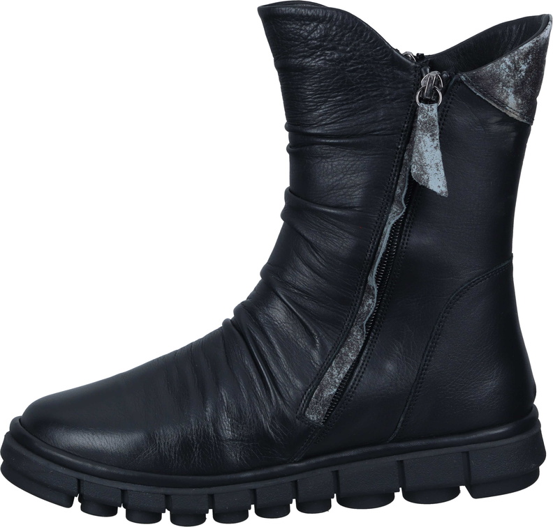 Damskie botki niemieckiej marki Manitu wykonane z wysokiej jakości miękkiej naturalnej skóry, w klasycznym w czarnym kolorze. Wnętrze botków oraz wkładka zostały wyłożone przyjemnym w dotyku, miękkim futerkiem, które skutecznie chroni stopy przed zimnem i zapewnia doskonały komfort termiczny nawet w najchłodniejsze dni. Model wyróżnia wysoka cholewka zapinana na dwa praktyczne zamki umieszczone po bokach – to rozwiązanie ułatwia szybkie zakładanie i zdejmowanie obuwia. Buty osadzone są na elastycznej podeszwie TR, która doskonale amortyzuje wstrząsy i zapewnia stabilność oraz pewny krok na różnego rodzaju nawierzchniach