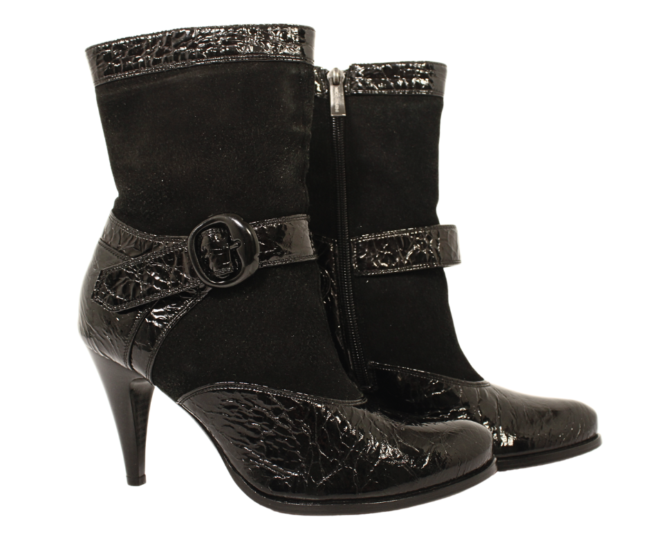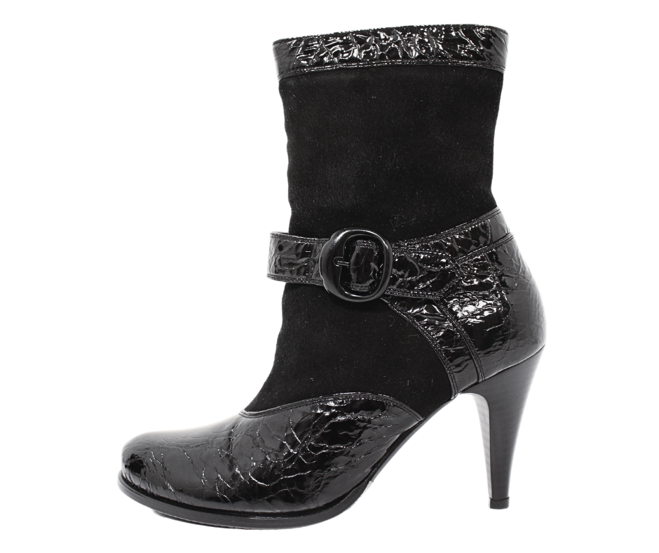 Połączenie lakierowanej skóry w gadzi wzór ze skórą zamszową tworzy projekt, który będzie świetnie prezentował się w stylizacjach eleganckich jak i mniej oficjalnych.