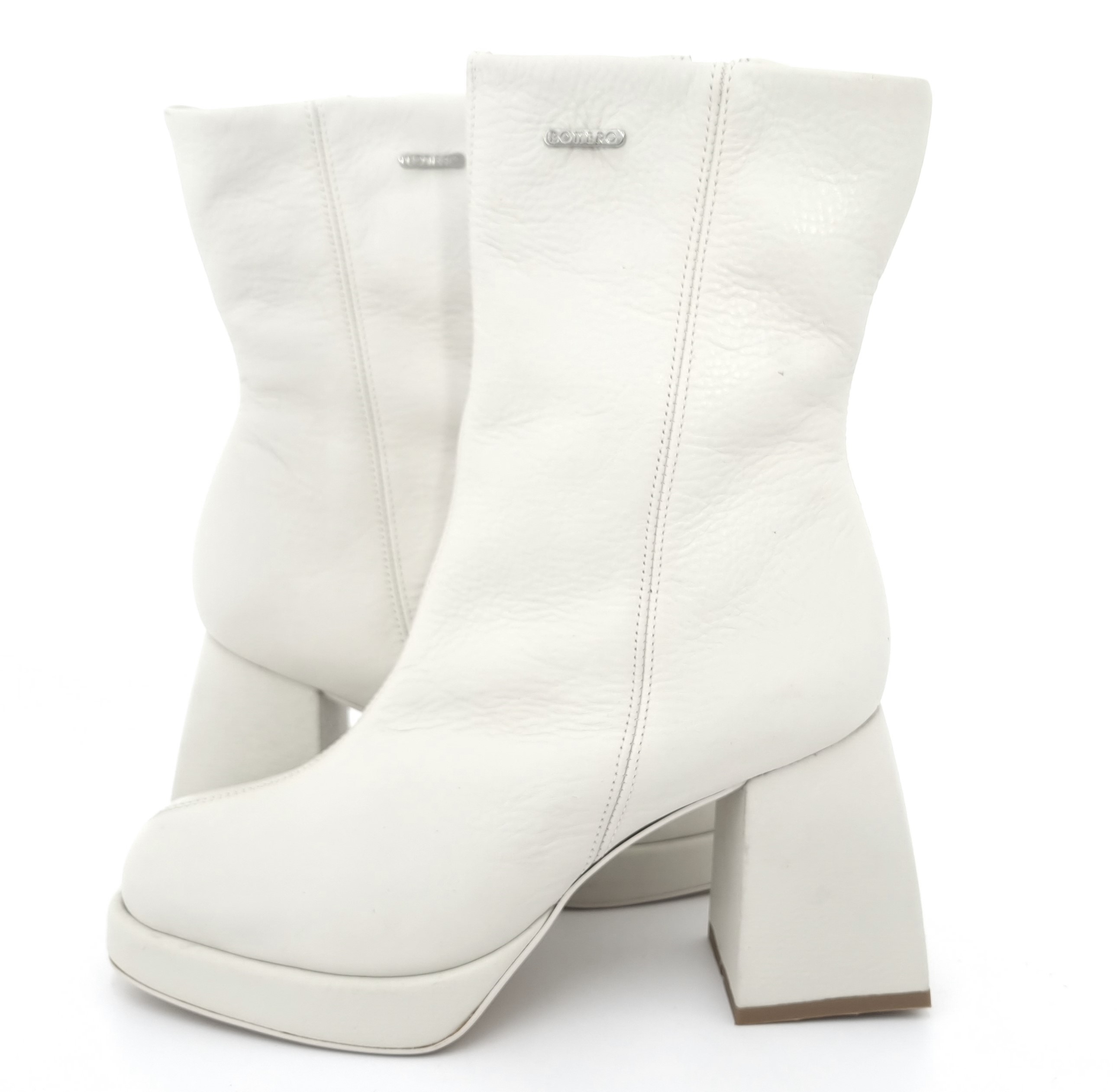 - Skórzane botki na słupku, w kolorze złamanej bieli, wykonane ze skóry licowej o charakterystycznej fakturze, przeszyte w centralnej części cholewki eleganckim szwem. Botki posiadają charakterystyczny kwadratowy nosek oraz ocieplenie wewnątrz.