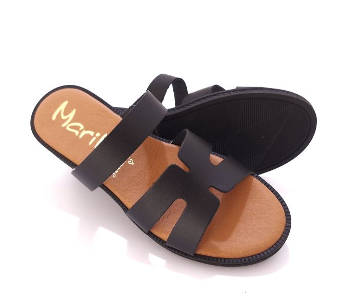 Czarne klapki damskie marki Marila wykonane z miękkiej skóry o gładkim licu w czarnym kolorze. Ich nowoczesny design wyróżnia cholewka w kształcie litery H, tworząca geometryczny wzór, który dodaje lekkości i elegancji. Płaski obcas zapewnia stabilność i komfort noszenia. Miękka wkładka zapewnia wygodę na każdym kroku. Wkładka oraz wyściółka z ekoskóry gwarantują przyjemność użytkowania.
