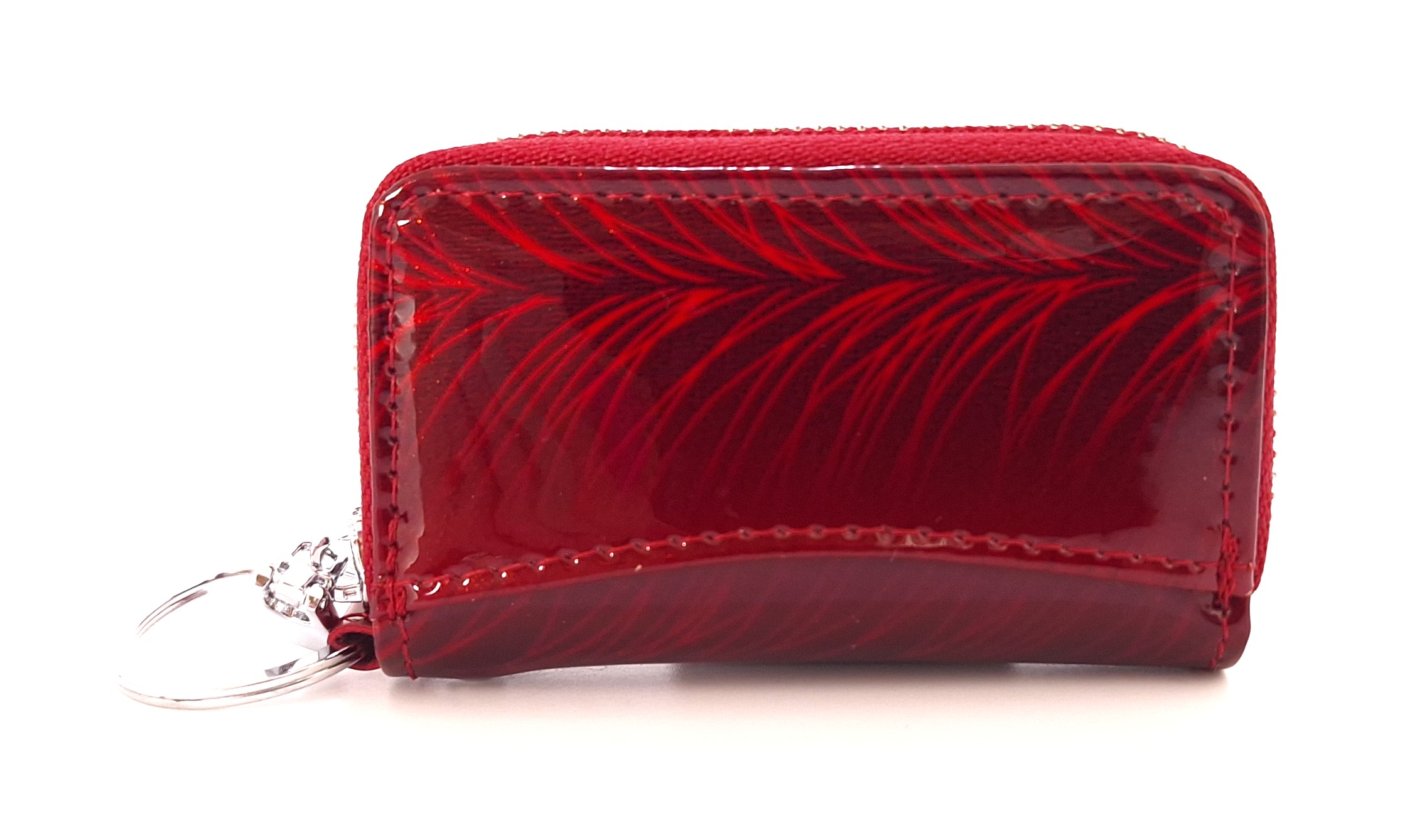 Małe etui na klucze w czerwonym kolorze. Wykonane z naturalnej, lakierowanej skóry o wzorze imitujacym piórka. Model o prostokątnym kształcie idealnie zmieści się w każdej torebce. Wewnątrz znajduje się metalowy łańcuszek w dwoma kółeczkami do przypięcia kluczy. Na zewnętrznej stronie znajduje się małe okrągłe kółko, służące do przymocowania kilku kluczy. Kluczówka zapinana jest dookoła na zamek błyskawiczny.