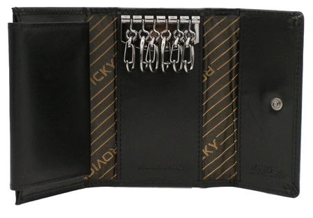 Klasyczne etui na klucze marki Rovicky wykonane z naturalnej skóry licowej o delikatnym połysku w czarnym kolorze. Posiada kieszonkę na bilon oraz miejsce na kartę. Całość zabezpieczona klapką na solidny zatrzask. Wnętrze kluczówki wyposażone w sześć zaczepów na klucze. Dzięki sprytnemu zastosowaniu haczyków, mamy możliwość grupowania kluczy według ich zastosowania, jednocześnie zapewniając ich bezpieczeństwo przed zgubieniem lub pomieszaniem. Etui posiada podszewkę z technologią antykradzieżową RFID.