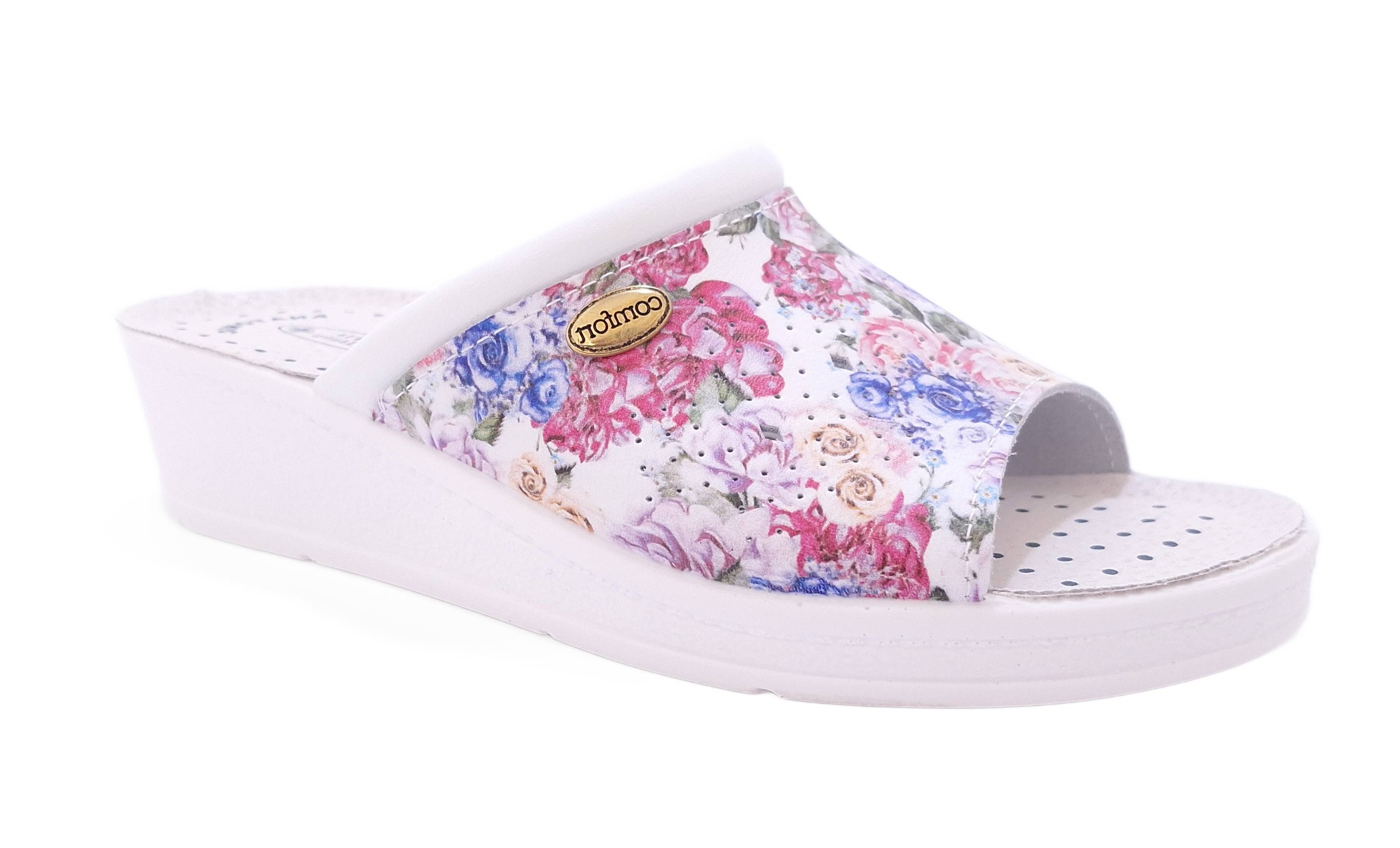 • Profilaktyczne klapki damskie. Wykonane ze skóry naturalnej. Cholewka perforowana w kwiatowy wzór. Model na niewysokiej koturnie. Podeszwa lekka, elastyczna.