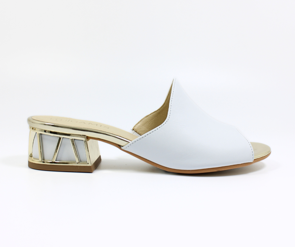 - Białe klapki na ozdobnym niskim słupku, wykonane z naturalnej skóry. Skórzana wyściółka i miękka wkładka zapewniają komfort użytkowania. Obuwie idealne do letnich stylizacji.