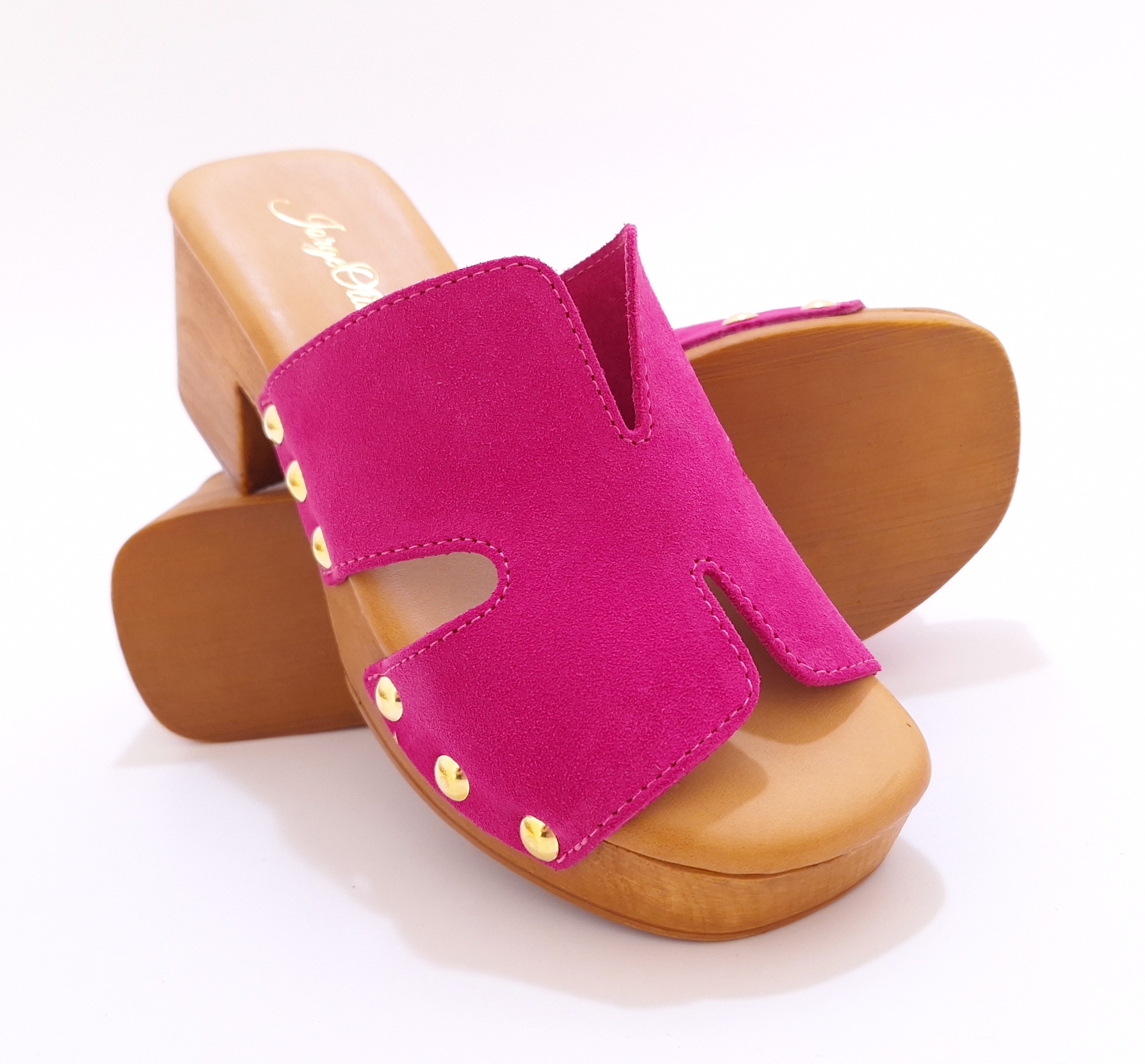 Damskie klapki na szerokim słupku marki Jorge Oliveira. Cholewka w kształcie litery H, wykonana ze skóry zamszowej w kolorze fuksji, przyciąga spojrzenia i dodaje stylizacji wyrazistego charakteru. Całość dopełniają metalowe nity wokół podeszwy – subtelny, ale zdecydowany akcent. Miękka skórzana wkładka gwarantuje komfort noszenia przez cały dzień. Klapki osadzone są na stabilnym, szerokim słupku imitującym drewno, który w połączeniu z platformą optycznie wysmukla sylwetkę i zapewnia komfort podczas chodzenia.