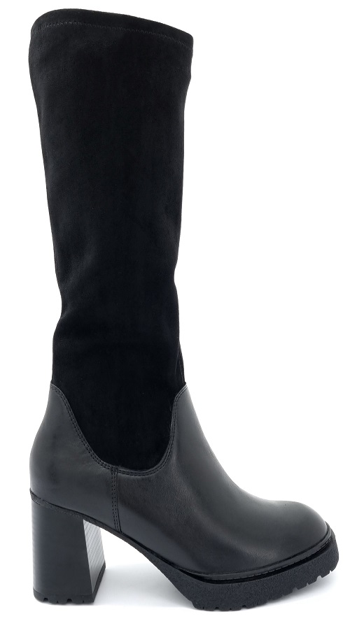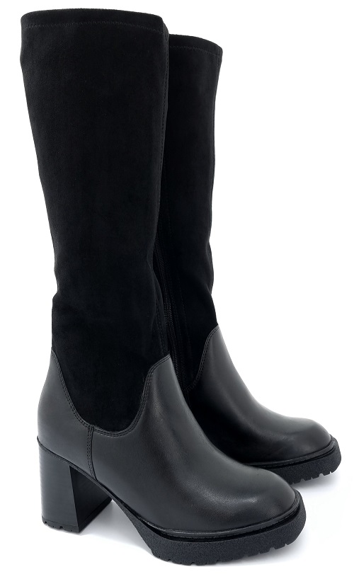 Wykonane z naturalnej skóry licowej w połączeniu z elstycznym stretchem. Elastyczny materiał, stanowiący górną część cholewki, zapewnia perfekcyjne dopasowanie do kształtu nogi. Wkładka wyjmowana wykonana z pianki z technologią Memontion, która dopasowuje się do kształtu stopy i amortyzuje twarde uderzenia podczas użytkowania. Wysoka cholewka mierząca 36 cm,skutecznie będzie osłaniać Twoje nogi przed chłodnym wiatrem. W zakładaniu i zdjemowaniu obuwia przydatny jest wygodny suwak. Model osadzony jest na grubej podeszwie, którą tworzy platforma oraz stabilny obcas mierzący 8 cm. Model lekko ocieplany.