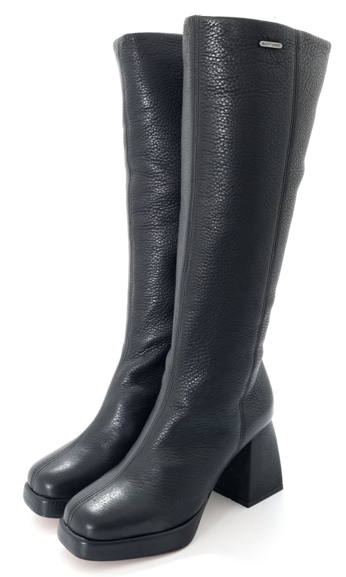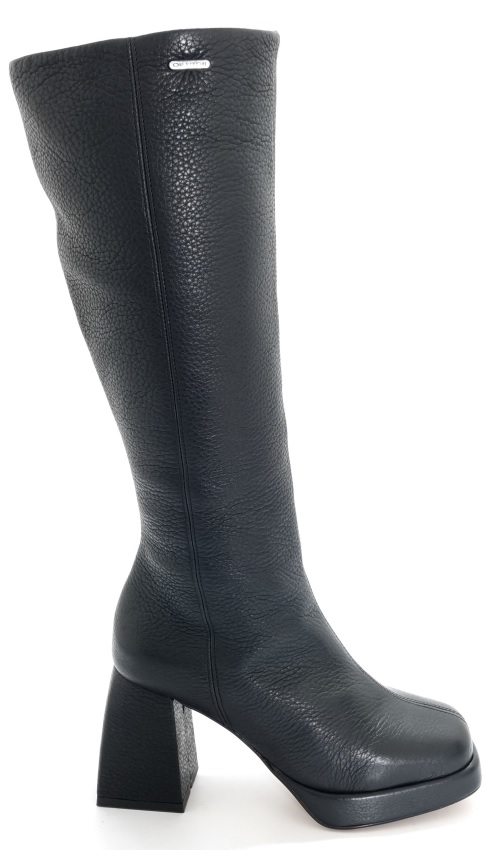 Eleganckie czarne kozaki na słupku marki Bottero, będą perfekcyjnym uzupełnieniem Twojej garderoby. Wykonane z wysokiej jakości skóry naturalnej licowej, co gwarantuje nie tylko trwałość, ale również niezrównany komfort noszenia. Klasyczny krój został przełamany oryginalnym, nowoczesnym obcasem, tworząc modne połączenie, które nadaje Twojej jesiennej stylizacji wyjątkowego charakteru. Cholewka posiada fakturę skóry, przeszyta przez środek nowoczesnym szwem, dodając butom szyku i ekstrawagancji. Kozaki charakteryzuje kwadratowy nosek, co skraca optycznie długość stopy. Zamek błyskawiczny będzie pomocny w zakładaniu i zdejmowaniu obuwia. Dodatkowo w cholewce wszyto elastyczną wstawkę, dzieki czemu idealnie dopasujesz buty to nogi. Stabilny obcas w kształcie rozszerzanego ku dołowi klocka o wysokości 9 cm zdecydowanie wydłuża Twoje nogi. Przed chłodnym wiatrem Twoje nogi będzie chronić wysoka na 38 cm cholewka. Dodatkowo, zastosowano platformę o wysokości 2 cm, która zmniejsza ukos stopy, zapewniając odpowiednie podparcie oraz pewność kroku. Buty Bottero cechuje elegancki fason, sięgający do kolana, co sprawia, że będą idealnie wyglądać w towarzystwie sukienek.