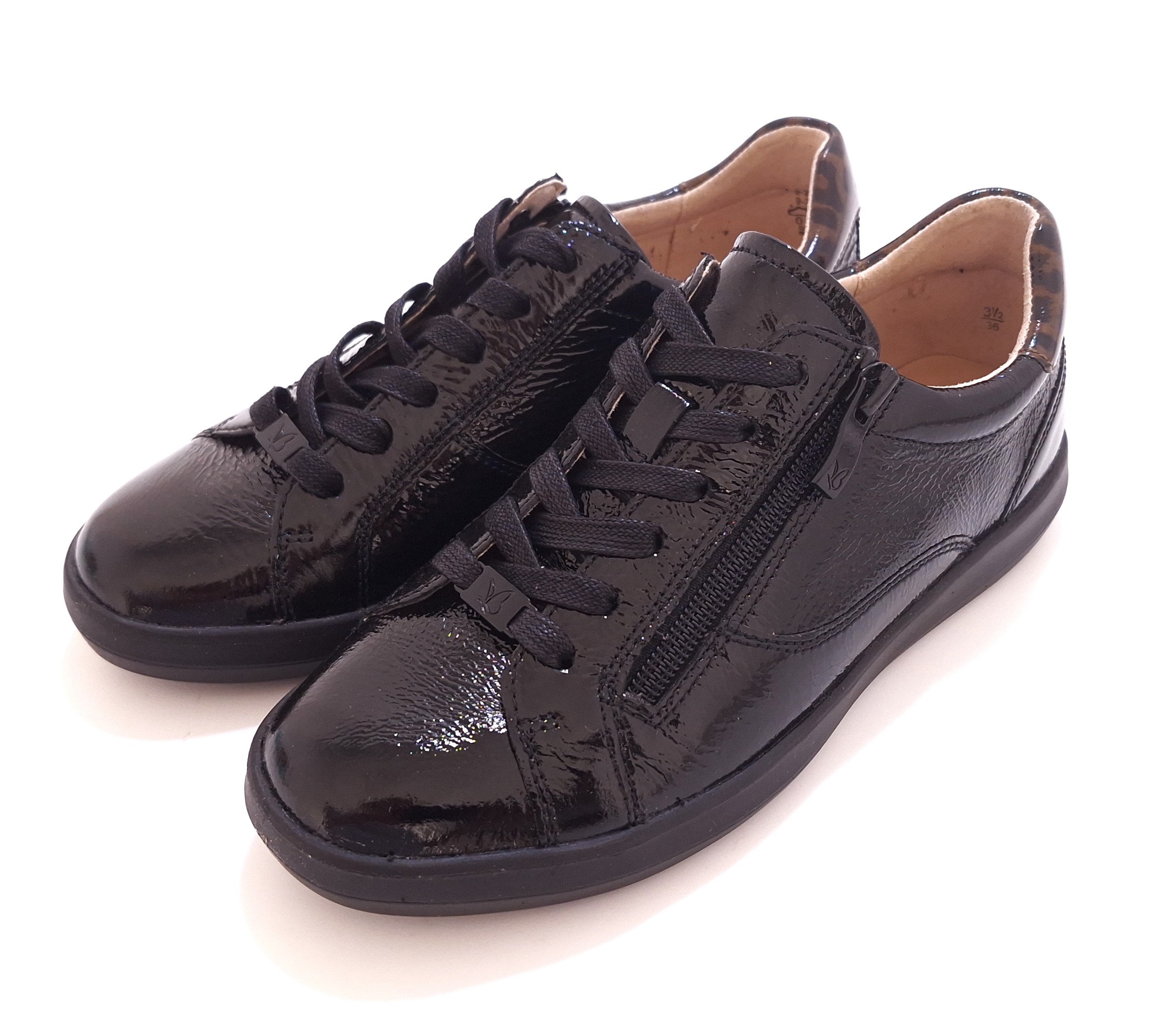 Sneakersy damskie marki Caprice to idealny wybór dla kobiet, które cenią elegancję i komfort w jednym. Wykonane z wytrzymałej, lakierowanej skóry naturalnej zachwycają nowoczesnym designem oraz wysoką jakością wykonania. Subtelna wstawka w modny, panterkowy wzór nadaje im charakteru. Model został zaprojektowany z myślą o codziennym komforcie – boczny zamek błyskawiczny pozwala na szybkie zakładanie obuwia, a klasyczne sznurowanie umożliwia idealne dopasowanie do stopy. Głęboki czarny kolor sneakersów nadaje im uniwersalności, dzięki czemu doskonale uzupełnią zarówno sportowe, jak i casualowe stylizacje. To model, który z łatwością połączysz z jeansami, sukienką czy eleganckimi spodniami, tworząc modny i komfortowy look na każdą okazję.