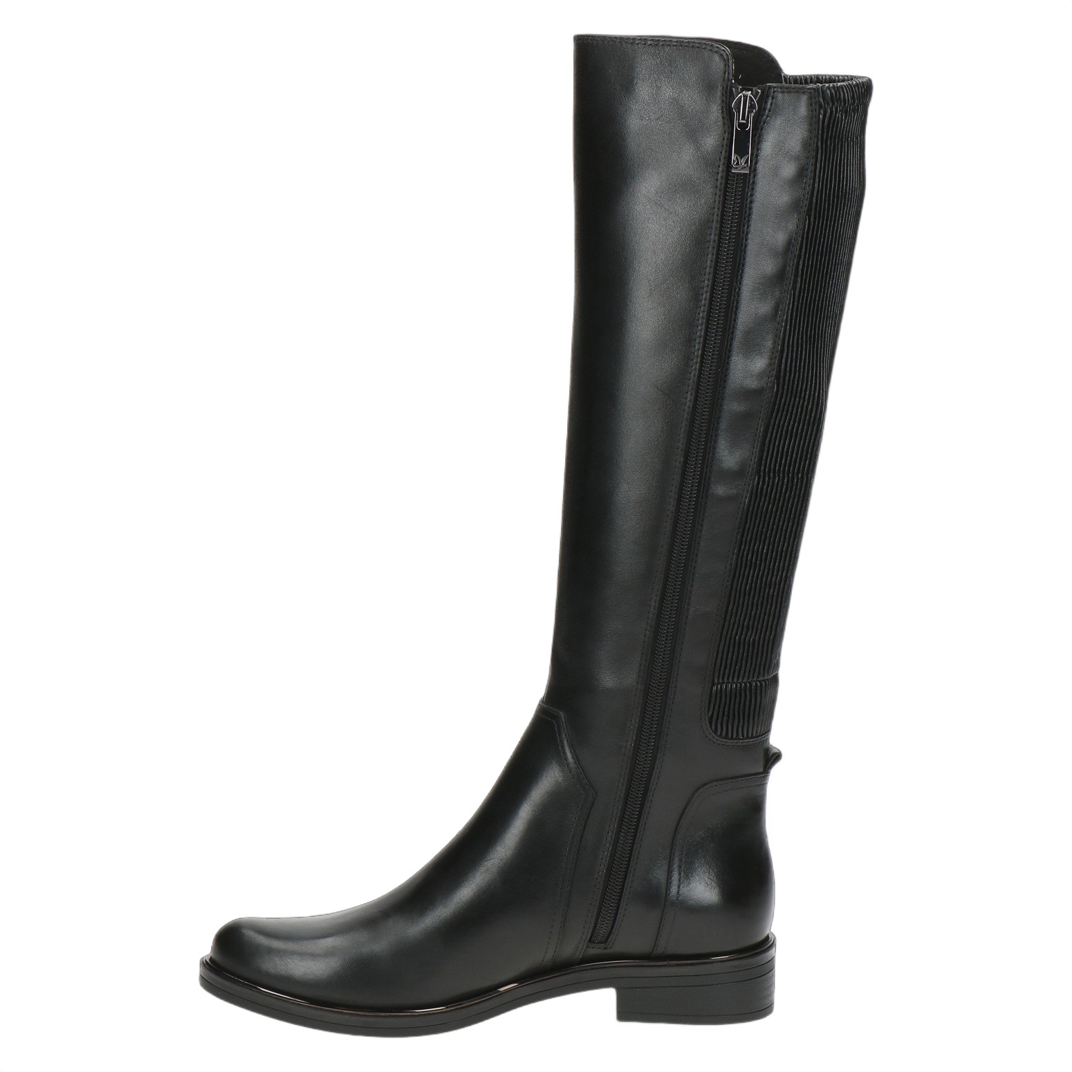 Kozaki damskie typu oficerki marki Caprice to model, który łączy funkcjonalność i elegancję, idealne na chłodne dni. Wykonane z naturalnej skóry. Wysoka cholewka z bocznym zapięciem na zamek błyskawiczny ułatwia zakładanie, a tylna część z elastycznego materiału syntetycznego perfekcyjnie dopasowuje się do łydki, zapewniając komfort noszenia. Płaska podeszwa gwarantuje wygodę noszenia przez cały dzień. Klasyczna czerń sprawia, że kozaki te świetnie sprawdzą się zarówno w stylizacjach casualowych, jak i bardziej eleganckich.
