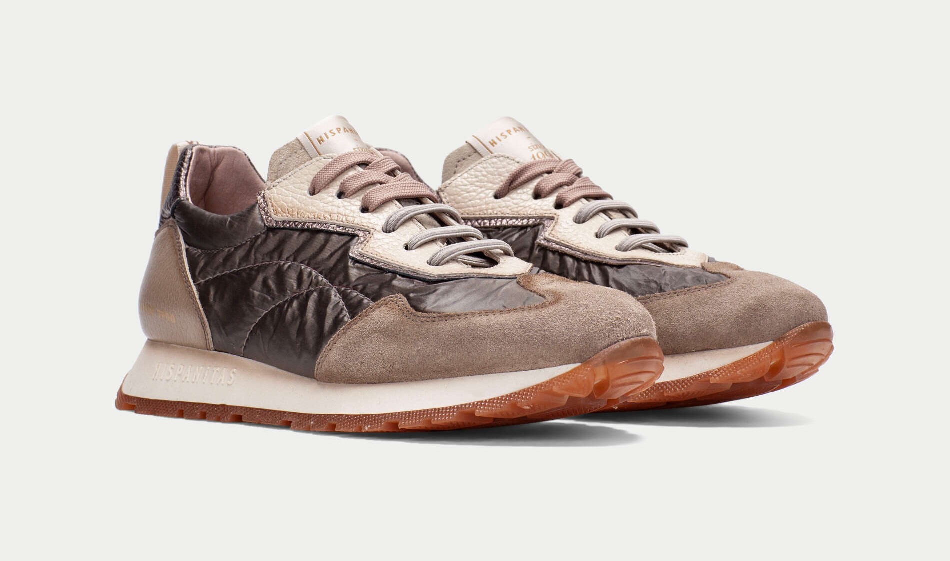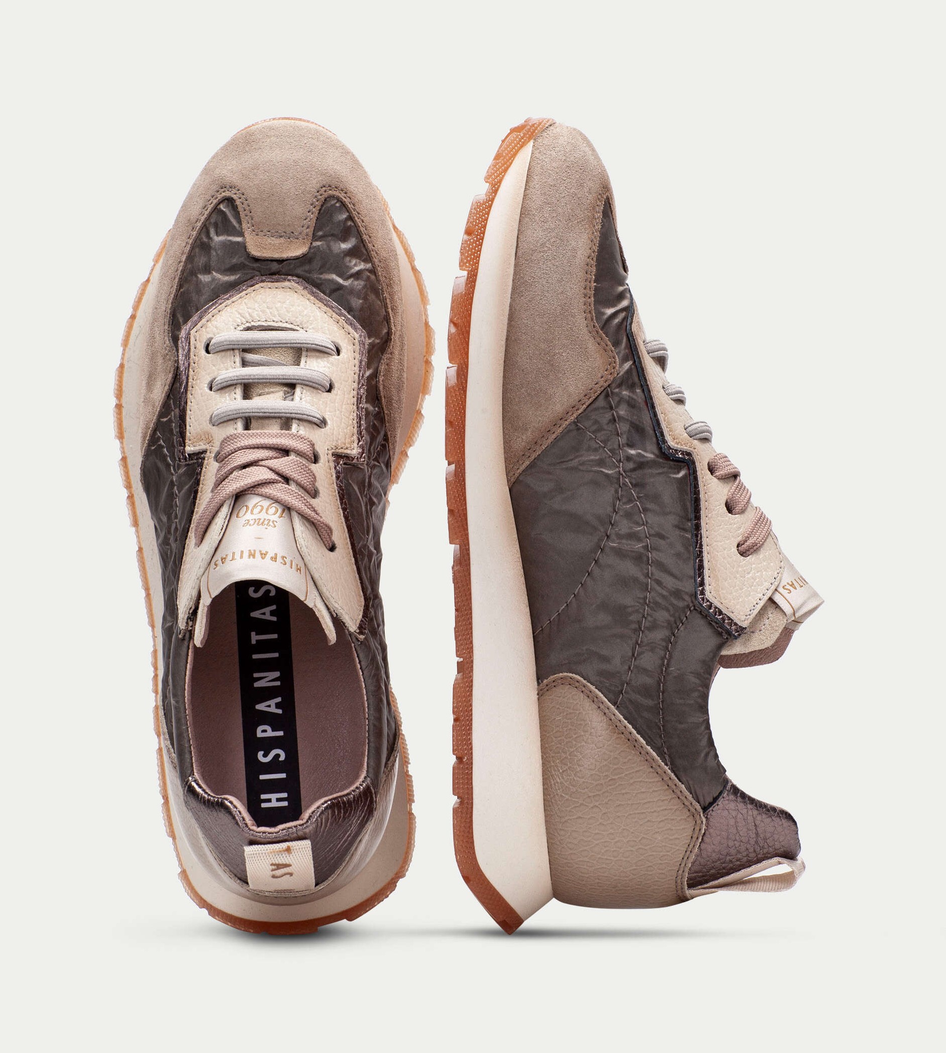 Damskie sneakersy Hispanitas to połączenie miejskiego stylu z eleganckim wykończeniem. Cholewka wykonana została z połączenia skóry licowej, miękkiego zamszu oraz nylonowych wstawek w szarosrebrnym kolorze, które subtelnie kontrastują z fakturą skóry. Taka kompozycja materiałów nadaje obuwiu nowoczesny i stylowy wygląd. Uniwersalna, stonowana kolorystyka sprawia, że sneakersy doskonale wpisują się w różne stylizacje – od sportowych po casualowe. Model wyposażono w lekką, elastyczną podeszwę z wyraźnym bieżnikiem, która skutecznie amortyzuje wstrząsy i zapewnia wygodę podczas codziennego użytkowania oraz dłuższych spacerów. Dzięki elastycznym sznurowadłom buty dopasowują się idealnie do kształtu stopy, co przekłada się na jeszcze większy komfort noszenia.