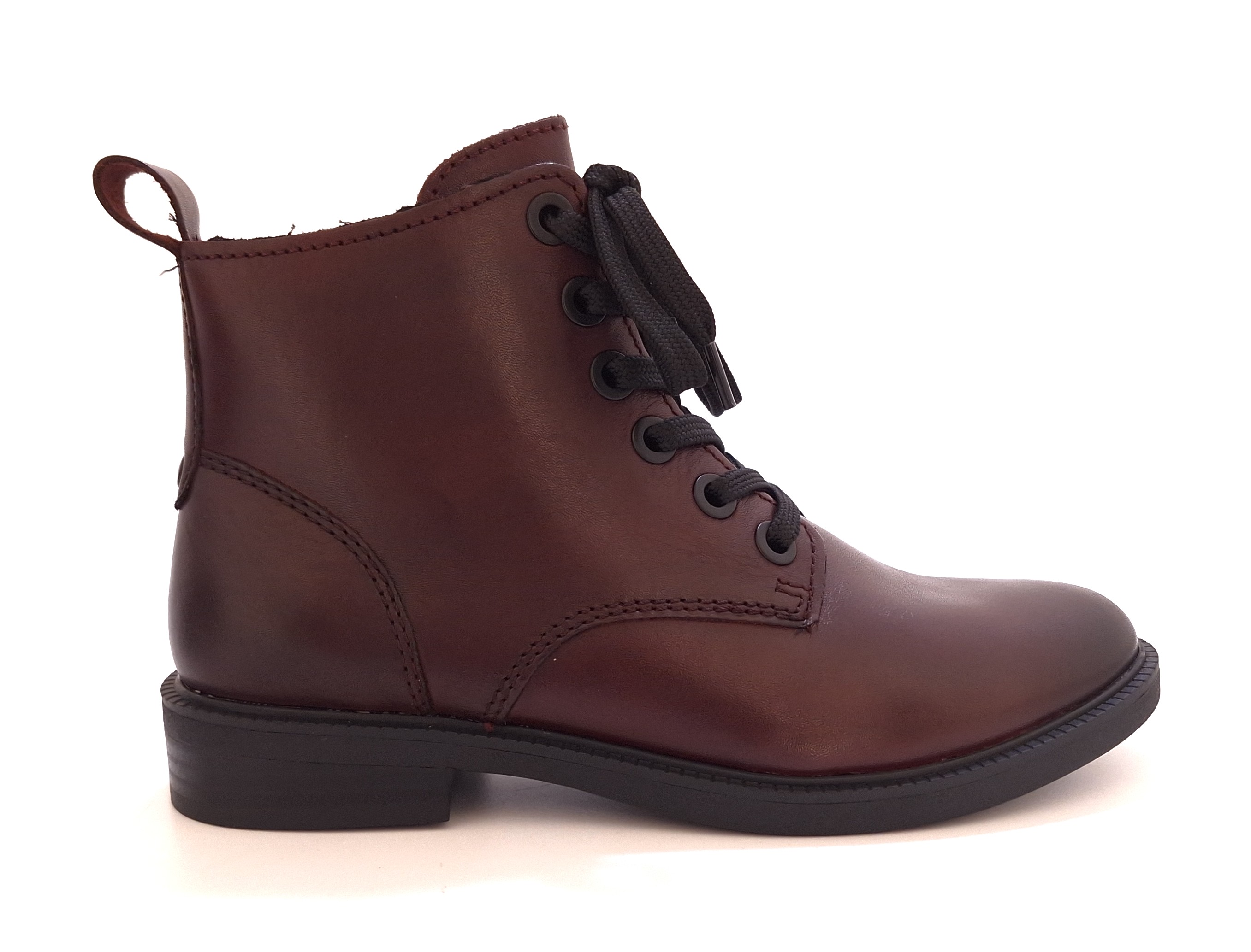 - Lekko ocieplane skórzane trzewiki na płaskim obcasie w bordowym kolorze.