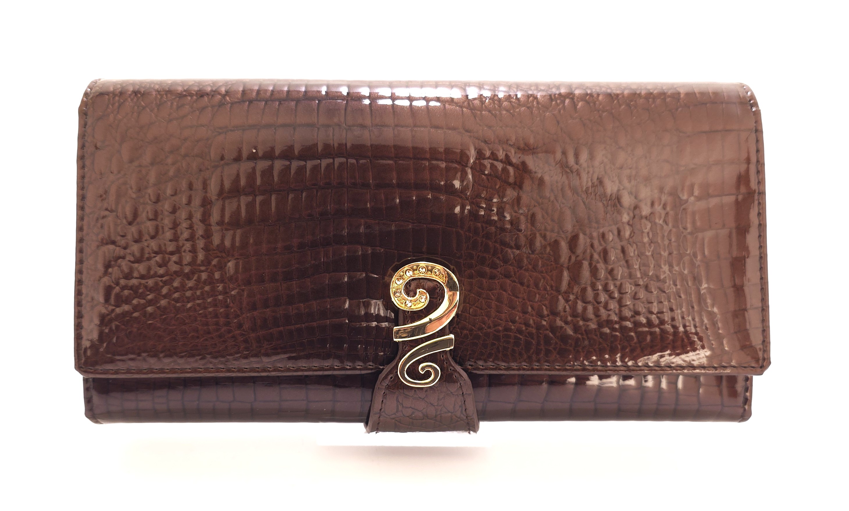 Stylowy damski portfel marki Angela Moretti w kolorze brązowym to niezbędny dodatek dla kobiety. Wykonany z wysokiej jakości naturalnej, lakierowanej skóry, gwarantuje nie tylko trwałość, ale również estetyczny wygląd. Lakierowane wykończenie dodaje elegancji. Portfel zamykany paskiem na zatrzask. Wewnątrz liczne przegródki na dokumenty ID( karty, wizytówki, dowód osobisty), kieszeń na banknoty oraz kieszeń zapinana na bigiel na bilon. Z tyłu otwarta kieszeń.
