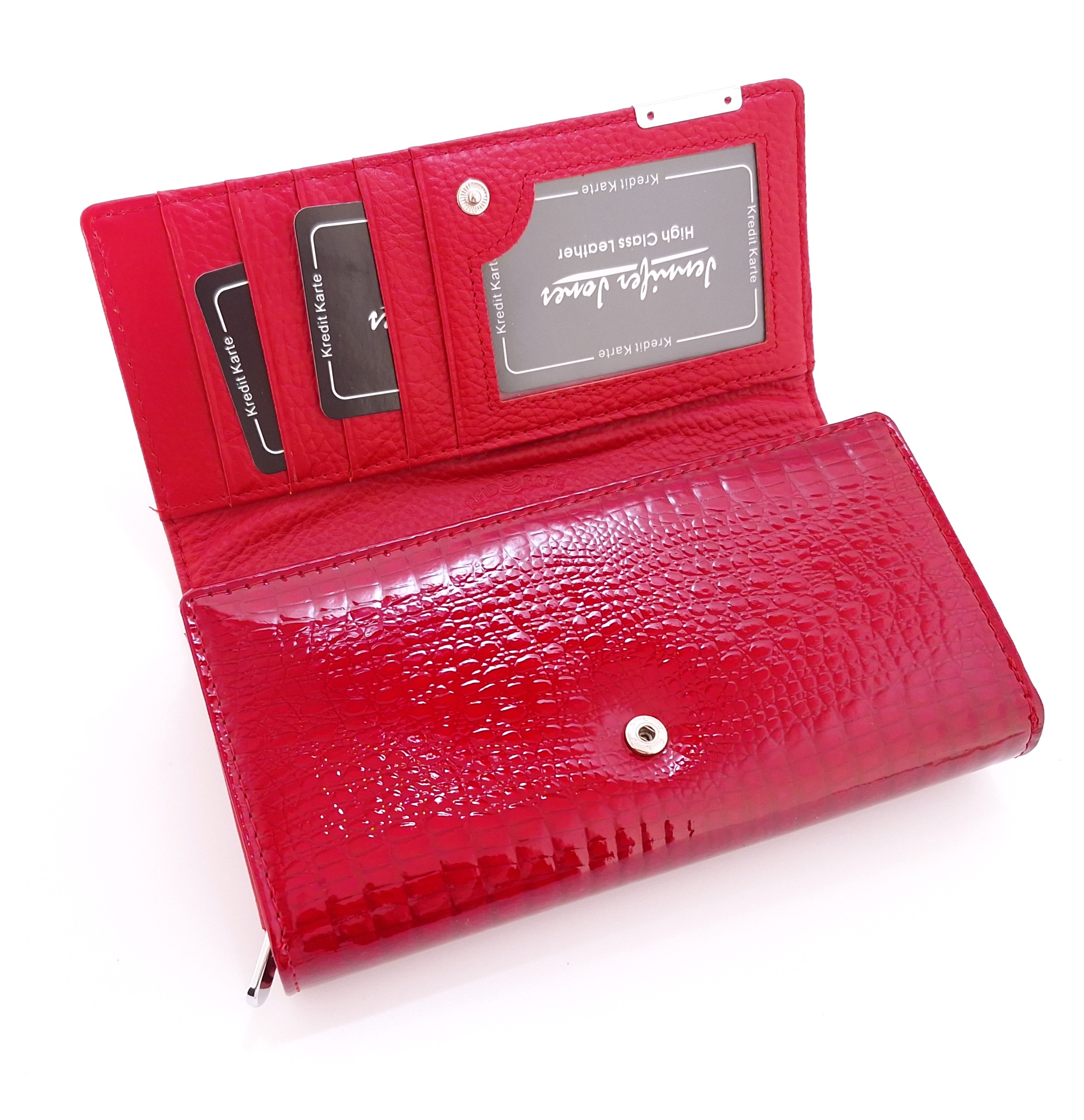 Duży, poziomy damski portfel z klapką marki Jennifer Jones w czerwonym kolorze to funkcjonalny dodatek dla osób ceniących sobie klasyczny styl. Wykonany z wysokiej jakości lakierowanej skóry naturalnej, zachwyca wyrazistą strukturą imitującą skórę krokodyla, która nadaje mu szykownego charakteru. Portfel zaprojektowany został z myślą o maksymalnej funkcjonalności. Zamyka się na klapkę z zatrzaskiem, dzięki czemu jego zawartość pozostaje bezpieczna i łatwo dostępna. Przemyślany podział wnętrza na dwie niezależne sekcje ułatwia organizację: