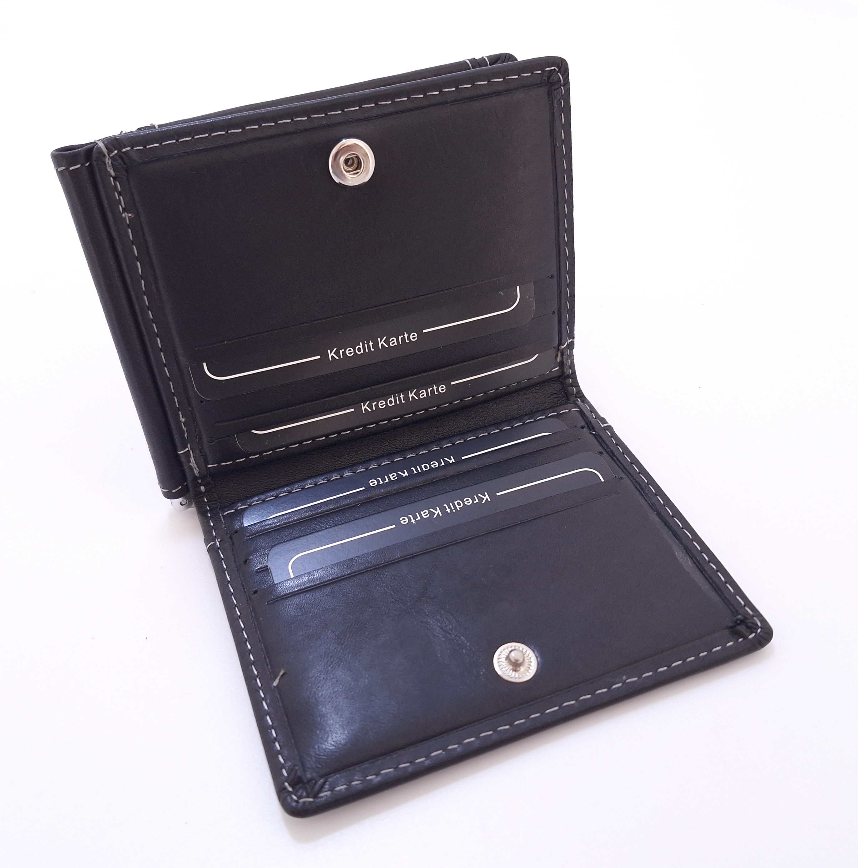 Czarny portfel męski marki Wild wykonany z wysokiej jakości naturalnej skóry licowej. Model charakteryzuje się poziomym układem i niewielkimi rozmiarami, które idealnie mieszczą się w kieszeni spodni lub marynarki. Pomimo kompaktowego formatu, jego wnętrze zaskakuje pojemnością – pomieści zarówno banknoty, monety, jak i karty płatnicze. Wewnątrz przestrzeni przeznaczonej na banknoty znajduje się innowacyjne rozwiązanie: mały, metalowy drucik, delikatnie zwinięty i przymocowany na górze. Ten sprytny mechanizm pozwala na łatwe wsuwanie banknotów, jednocześnie tworząc skuteczną i bezpieczną barierę dla papierowych pieniędzy. Z przodu znajduje sie kieszonka na bilon zapinana na nap. Dodatkowo portfel posiada oddzielną sekcję na karty, zamykaną na zatrzask – idealne rozwiązanie dla tych, którzy potrzebują szybkiego dostępu do dokumentów i kart płatniczych.
