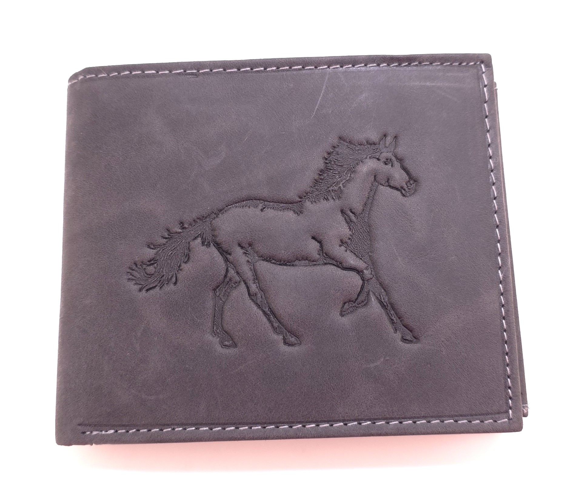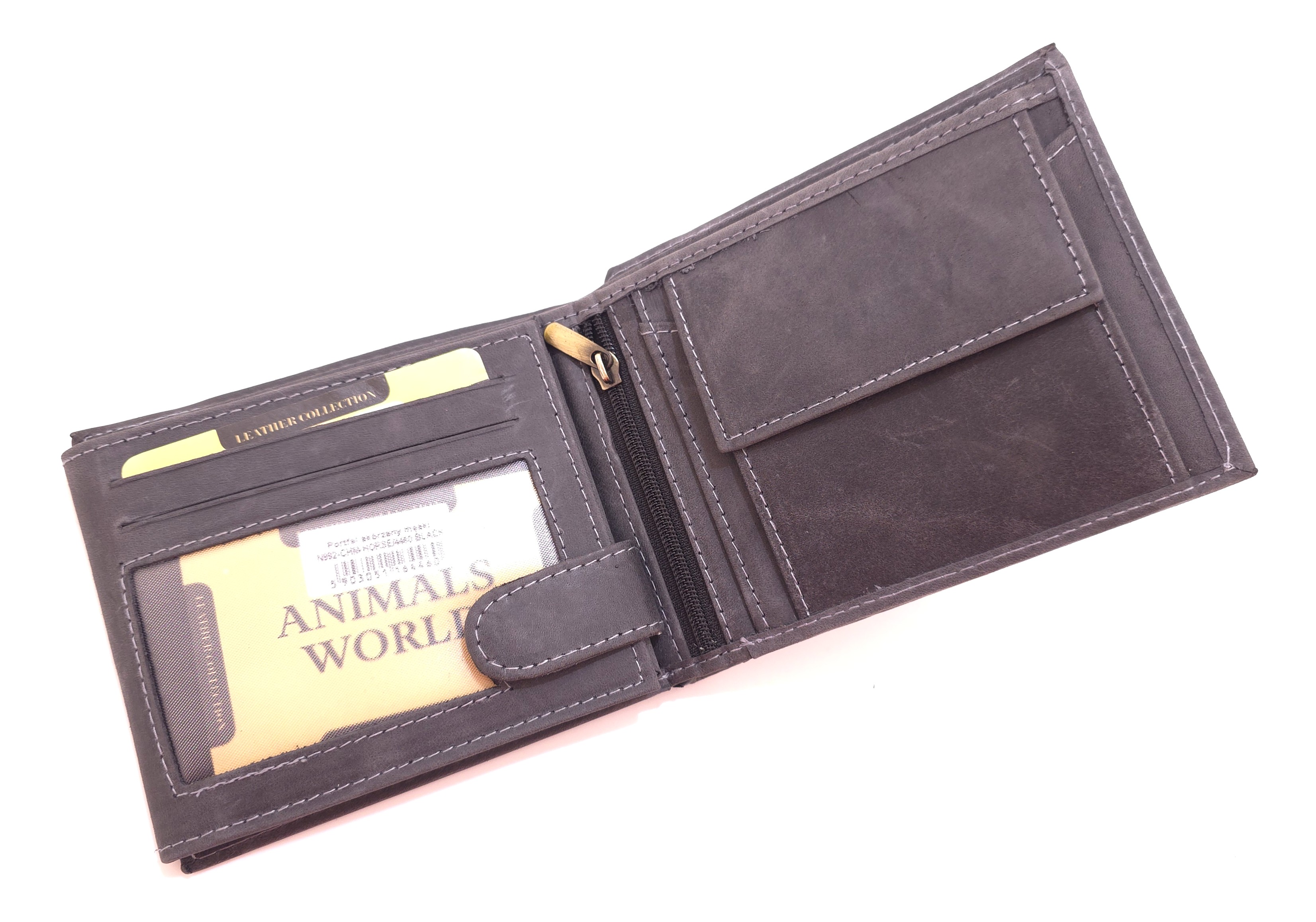 - Duży portfel męski z naturalnej skóry nubukowej o orientacji poziomej bez zapięcia zewnętrznego. Na froncie motyw konia. Wyposażony w system RFID.