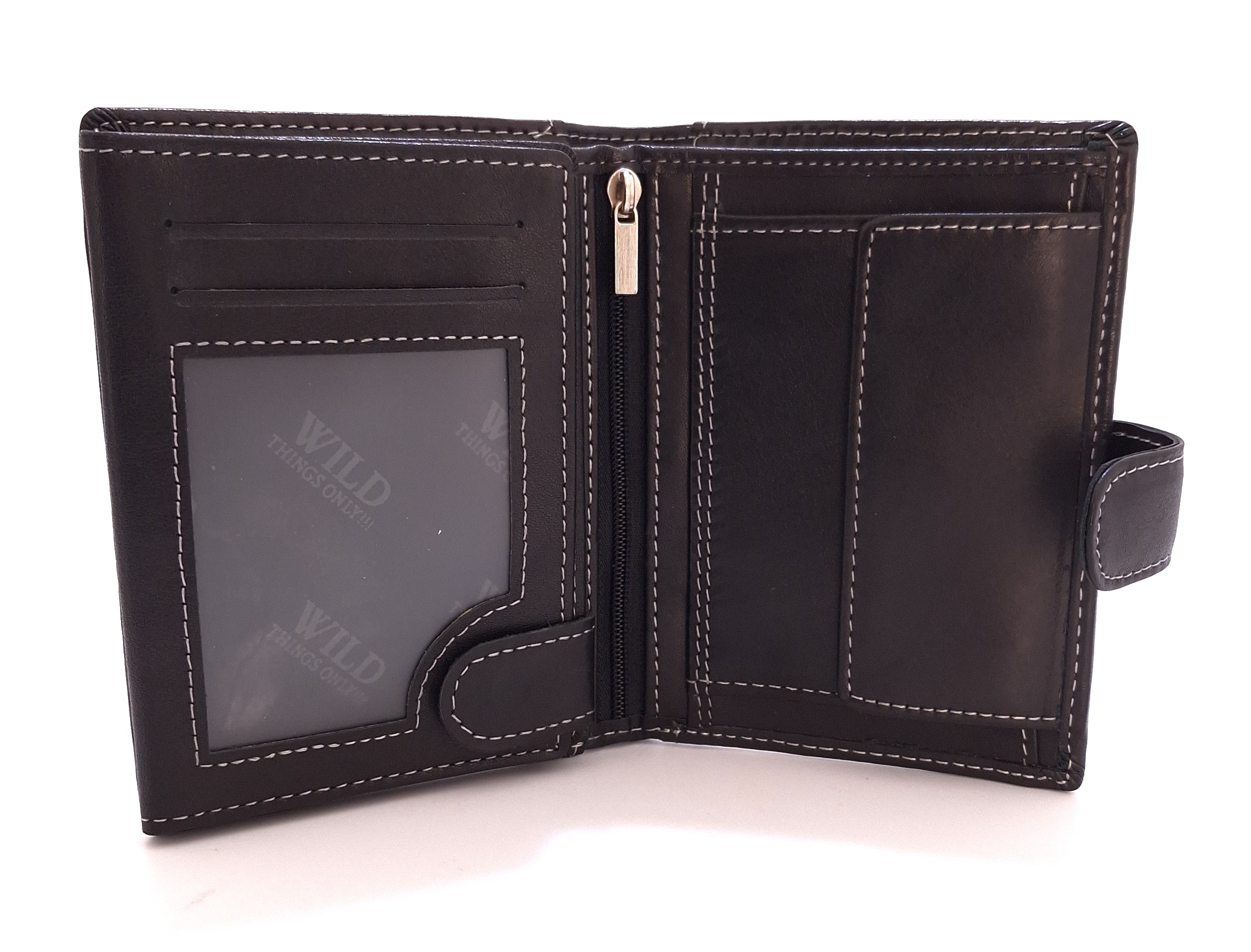 Duży składany portfel męski marki Wild wykonany ze skóry licowej w ciemno brązowym kolorze, zapinany na zatrzask. Poziomy układ zapewnia wygodę użytkowania. Portfel posiada dużą ilość przegródek dzięki czemu uporządkujesz wszystkie swoje dokumenty. Technologia RFID, w którą wyposażony jest portfel, skutecznie chroni Twoje karty płatnicze przed potencjalnymi skanowaniami, zapewniając Ci bezpieczeństwo podczas codziennych transakcji.Cechy charakterystyczne portfela: