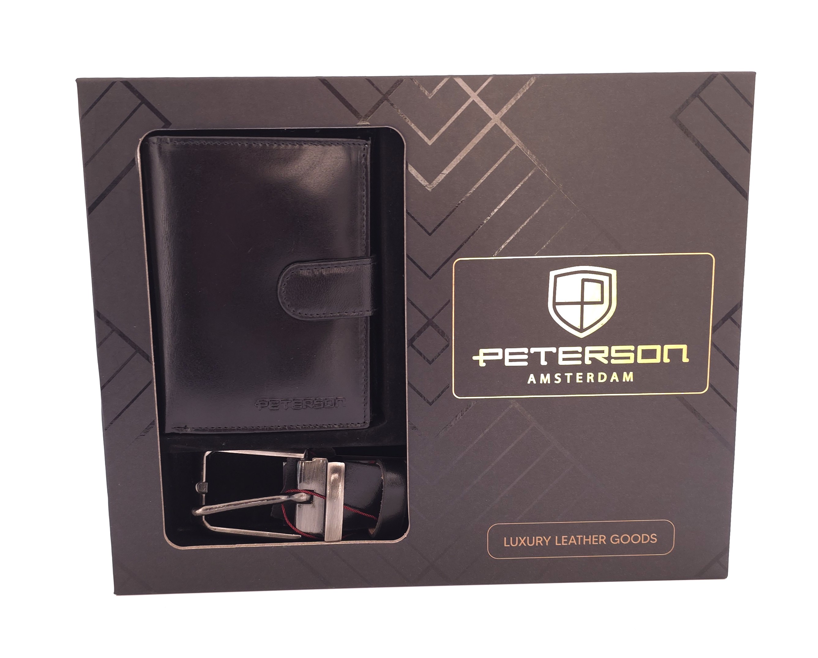 - Zestaw prezentowy składający się z paska i portfela od marki Peterson. Akcesoria wykonane ze skóry naturalnej. Portfel wyposażony w technologię RFID. Pasek wyposażony w tradycyjną klamrę. Całość zapakowana w pudełko.