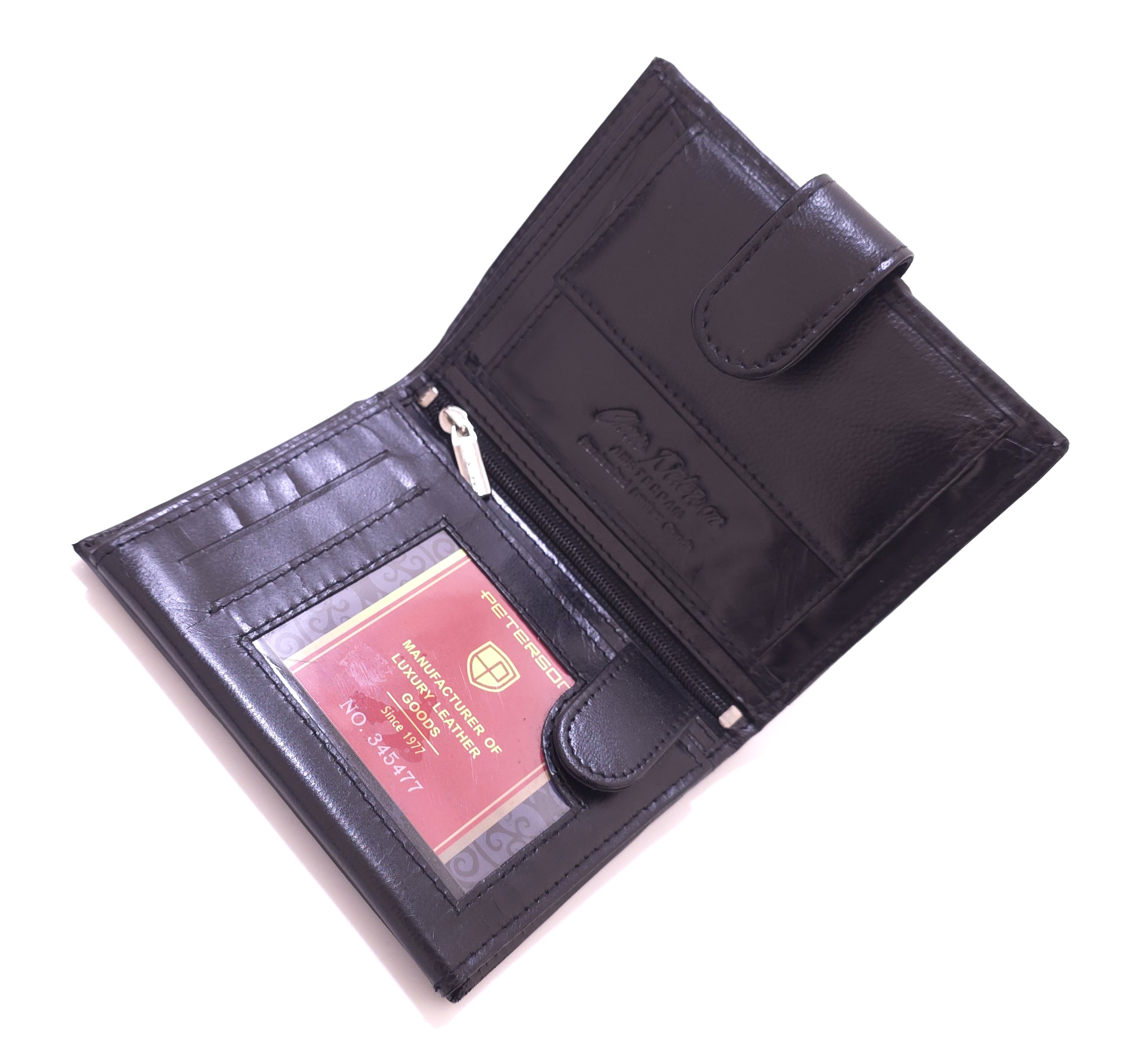 - 2 przegrody na banknoty wyszyte po szerokości portfela.