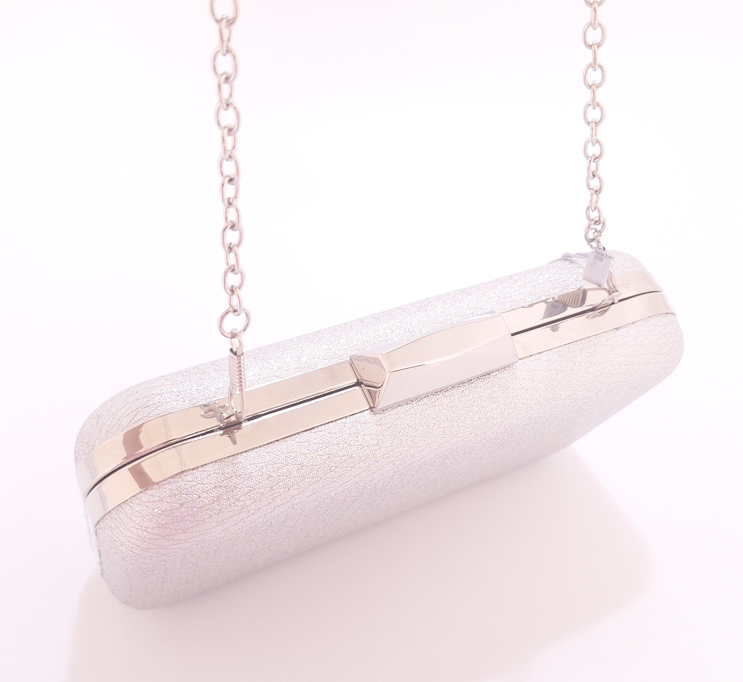 - Wieczorowa torebka w formie puzderka w srebrnym kolorze. Idealna na wesele, bal, uroczyste spotkanie towarzyskie.