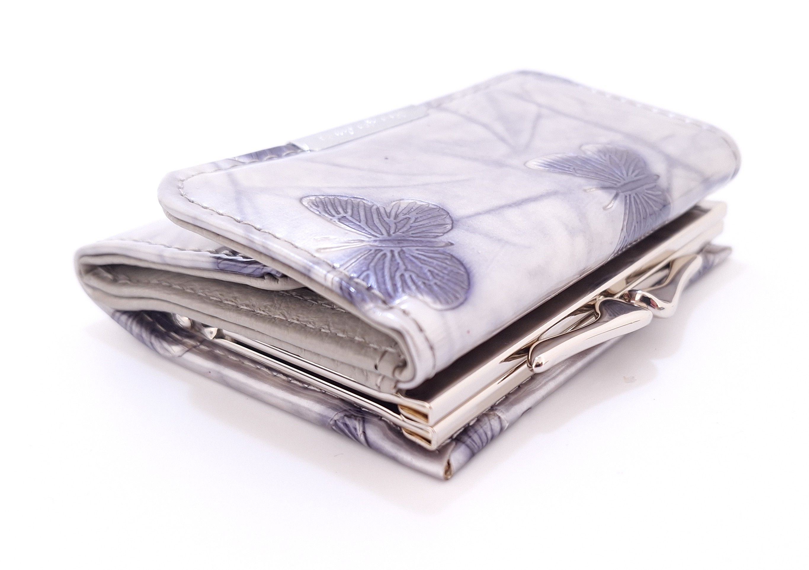 Czerwony portfel damski o fasonie portmonetki marki Jennifer Jones ozdobiony w motyli wzór. Model z klapką wykonany z lakierowanej skóry. Kompaktowy rozmiar sprawia, że idealnie mieści się w każdej damskiej torebce. Mimo niewielkich wymiarów, portfel oferuje praktyczne wnętrze, które pomieści wszystkie najważniejsze rzeczy – od monet, przez banknoty. Portmonetka dzieli się na dwie części: część na bilon zamykana jest na wygodną klamrę, zaś druga na nap.