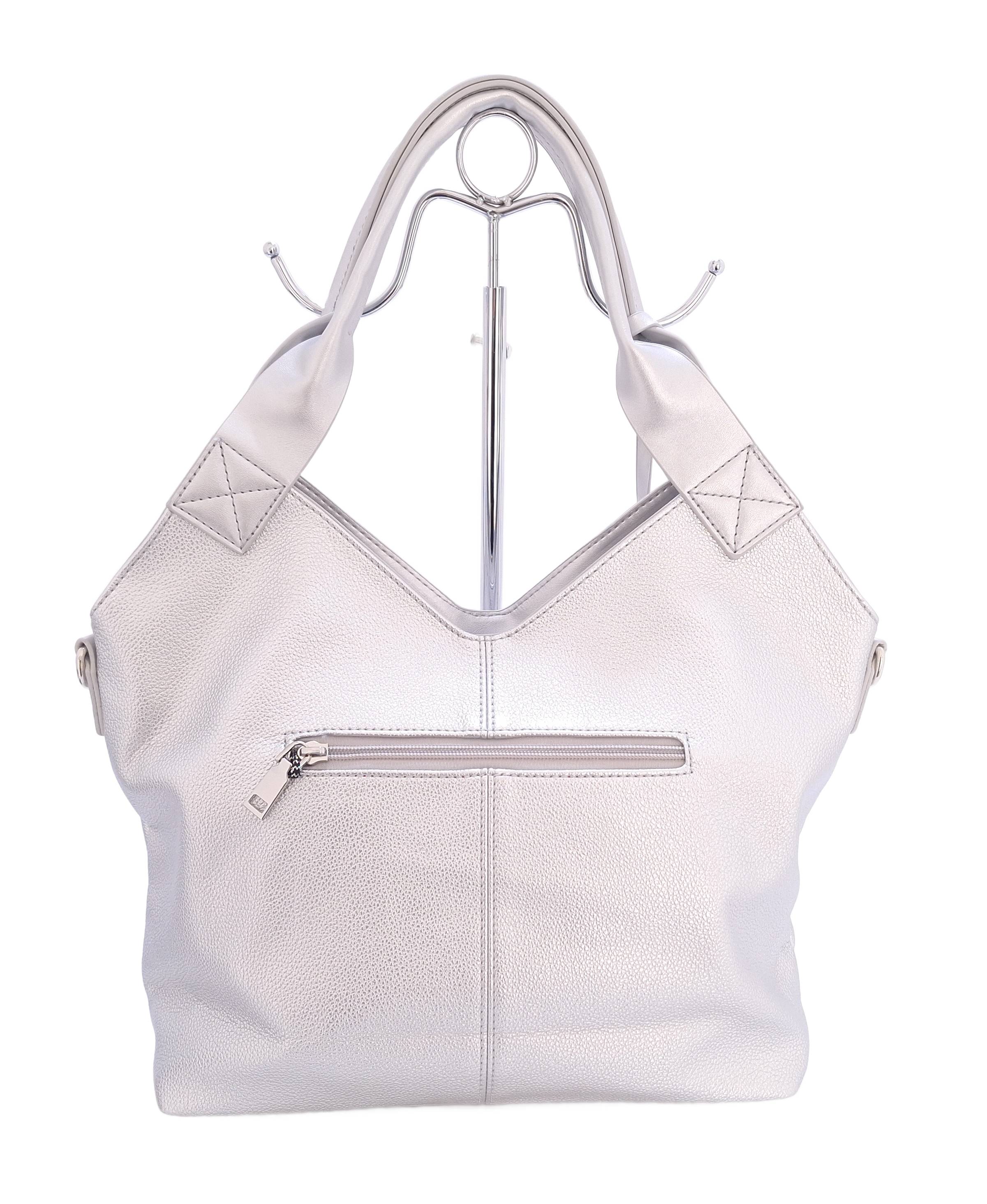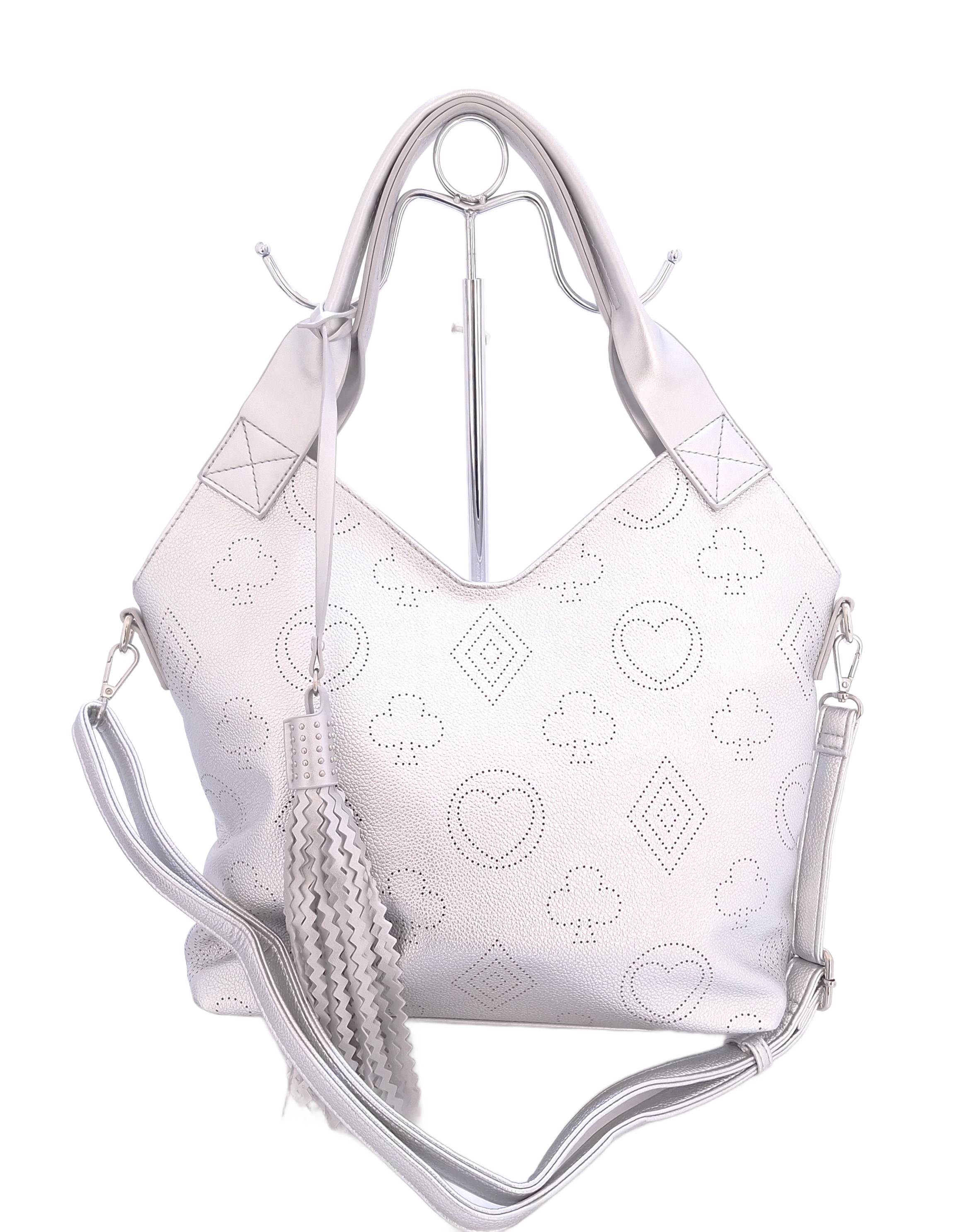 Stylowa, srebrna torebka damska na ramię marki Maria C to połączenie elegancji i funkcjonalności. Wykonana ze skóry ekologicznej, przyciąga uwagę laserowo wycinanym wzorem w kształcie serc, rombów i koniczyn. Fason lekko rozszerzający się ku górze sprawia, że torebka prezentuje się lekko i nowocześnie. Pojemne wnętrze z przegrodą na suwak pozwala na wygodne przechowywanie wszystkich niezbędnych przedmiotów. Torebka posiada wygodne uchwyty na ramię oraz regulowany pasek, który umożliwia noszenie torebki także na ukos. Całość uzupełnia ozdobny brelok z chwostem, który dodaje uroku i kobiecego akcentu.