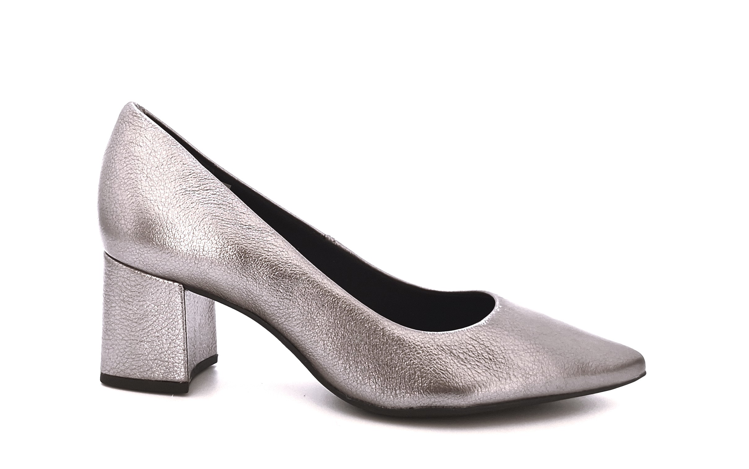 - Srebrne czółenka z naturalnej skóry. Stabilny obcas gwarantuje wygodę przez cały dzień.