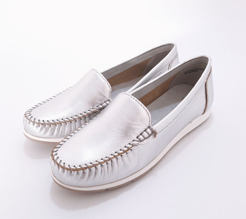 • Eleganckie mokasyny damskie Marco Tozzi ze skóry naturalnej w srebrnym kolorze.