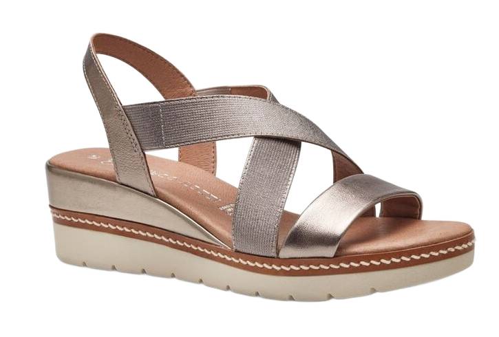 Odkryj sandały damskie na koturnie marki Marco Tozzi, które staną się kwintesencją Twojego letniego stylu! Wykonane z delikatnej skóry naturalnej w kolorze różowego złota, zachwycają subtelnym blaskiem i kobiecym charakterem. Komfortu noszenia zapewnia miękka, skórzana wkładka z technologią Feel Me, która idealnie dopasowuje się do stopy, dając uczucie ulgi i odprężenia. Dodatkowo po bokach pasków zastosowano elastyczne wsatwki z gumki, ktróre gwarantują perfekcyjne dopasowanie butów. Koturn o wysokości 5,5 cm to idealny kompromis między wygodą a optycznym wydłużeniem nóg.