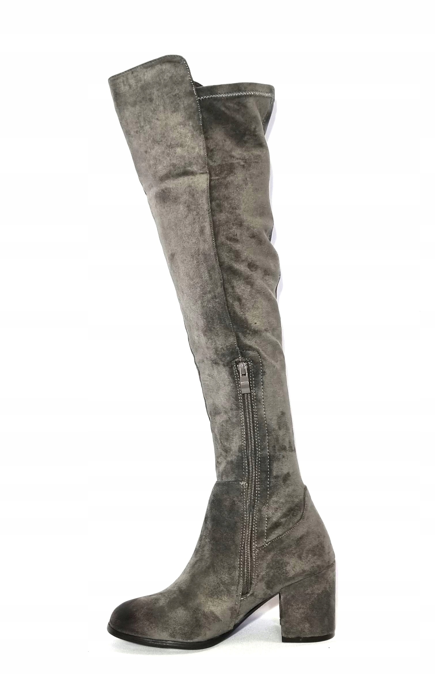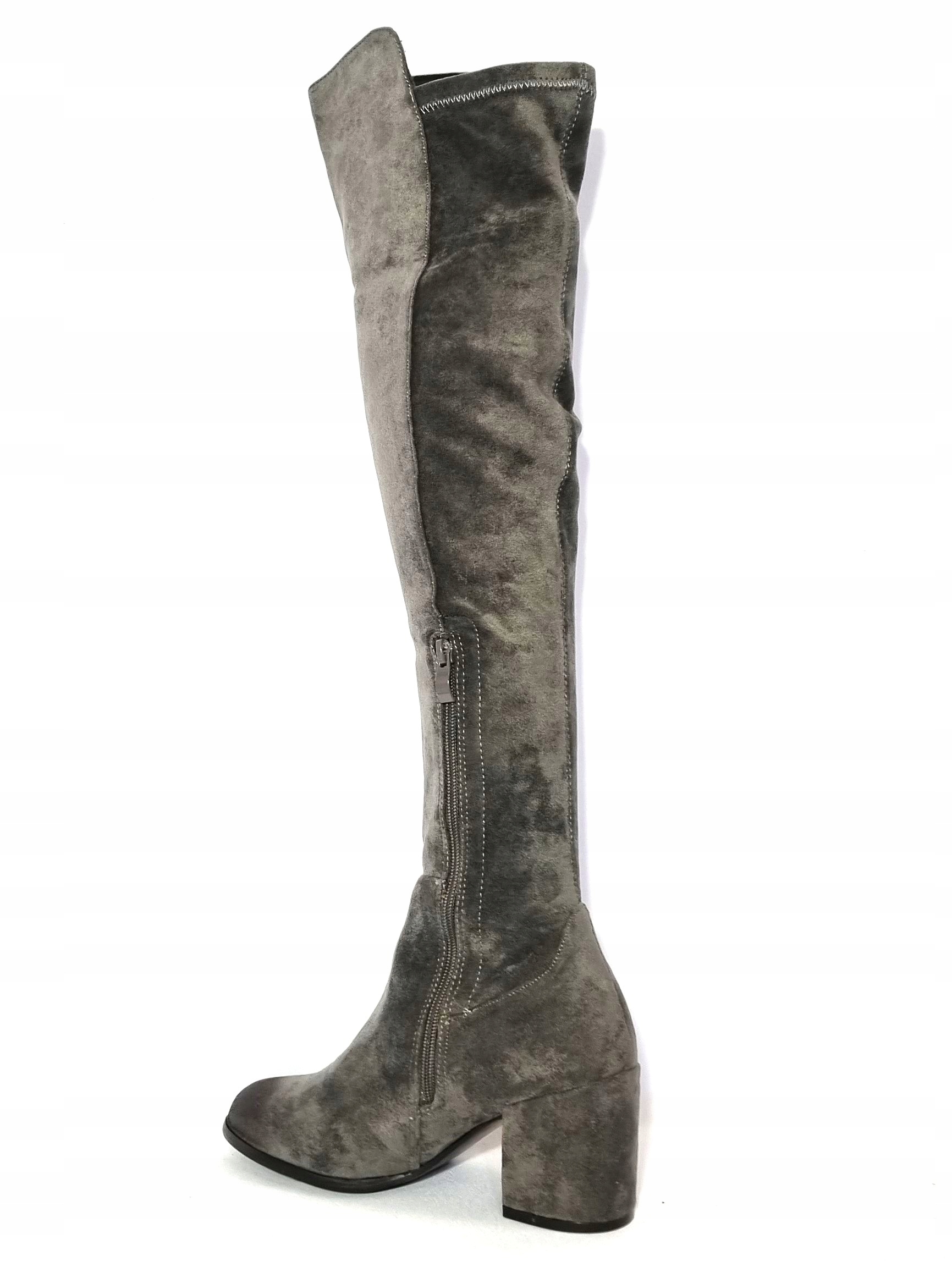 Eleganckie, szare kozaczki na 7,5 cm obcasie marki T.SOKOLSKI. Obuwie wykonane jest z wysokiej jakości materiałów. Cholewka częściowo ocieplona, długość za kolano. Kozaczki będą pasować do sukienki jak i do spodni.