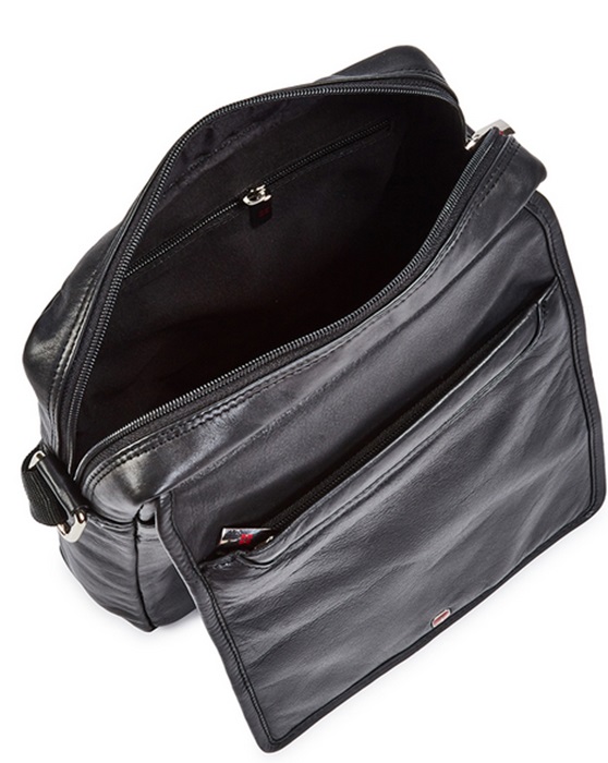 - Listonoszka męska z klapką w kolorze czarnym, wykonana z naturalnej skóry licowej. Model zawieszony na regulowanym pasku.