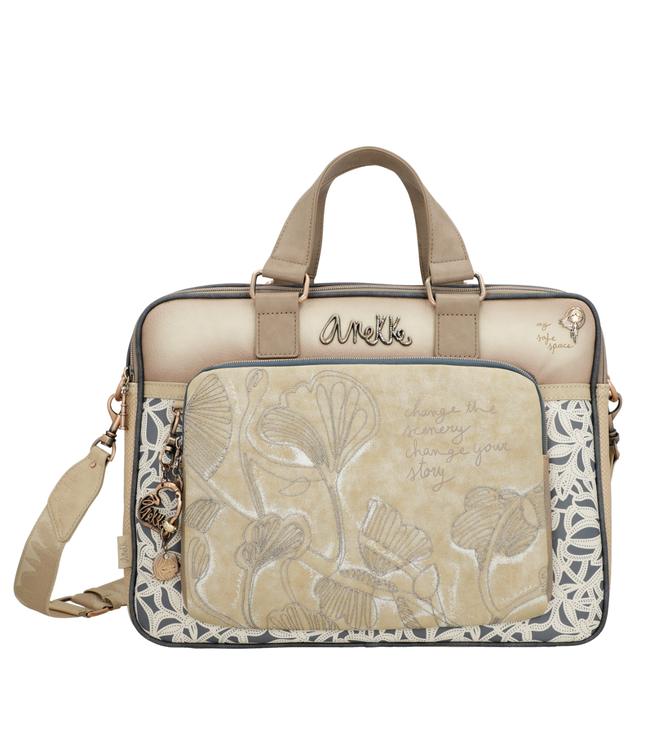 Damska torba na laptopa jest częścią kolekcji Anekke Memories z linii Whispers. Torba ma dwie odrębne komory, każda z nich zamykana na zamek błyskawiczny. Na zewnątrz z przodu jest jedna zamykana kieszeń. W części wewnętrznej znajdują się dwie otwarte kieszonki i jedną kieszeń na dokumenty zapinaną na zamek. Z tyłu są dwa suwaki które po otwarciu umożliwiają założenie teczki na rączkę walizki. Torba posiada uchwyt do noszenia w ręku, oraz odpinany, szeroki pasek do noszenia na ramieniu.