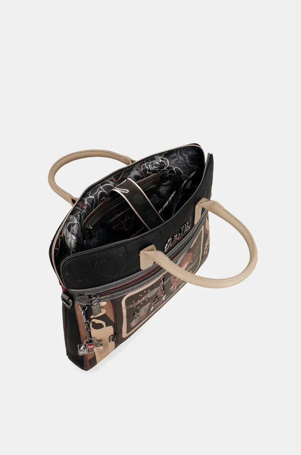 Torba posiada dwa uchwyty do przenoszenia oraz odpinany regulowany pasek na ramię. Jest duża, zawiera jedną komorę zamykaną na zamek błyskawiczny. Pasek na ramię jest szeroki. Wnętrze wyłożone oryginalną tkaniną z nadrukami z motywami z kolekcji, posiada kieszonki. Dodatkowo wyściełane dla ochrony urządzeń elektronicznych. Z przodu kieszeń zamykana na zamek. Z tyłu posiada dwa zamki błyskawiczne, które po otwarciu pozwolą na przystosowanie jej do rączki walizki, dzięki czemu można ją zabrać ze sobą w podróż. Jest to duża torba na dojazdy do pracy, idealna do przenoszenia komputera i innych dokumentów.