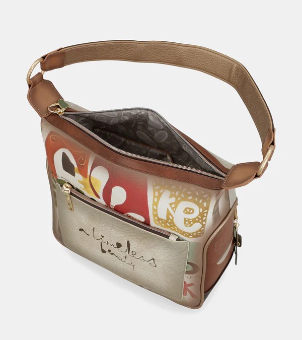 Torebka damska na ramię z kolekcji Anekke Muse SS26 wykonana z ekologicznej skóry. Torebka posiada jedną obszerną komorę zamykaną na zamek błyskawiczny. Wnętrze wyłożone podszewką z motywem kolekcji. Wewnątrz umieszczono dwie otwarte kieszonki oraz jedną zamykaną na suwak. Z tyłu znajduje się kieszeń zamykana na zamek. Główną ozdobą jest nadruk przedstrawiający grafikę Anekke na tle greckich, antycznych kolumn, wzbogacony haftami, metalowymi przypinkami i odpinany brelok. Torebka wyposażona w dwa uchwyty: 1 krótszy, szerszy pasek do noszenia na ramieniu oraz doczepiany, cienki pasek z możliwością regulacji do przewieszenia przez ramię.
