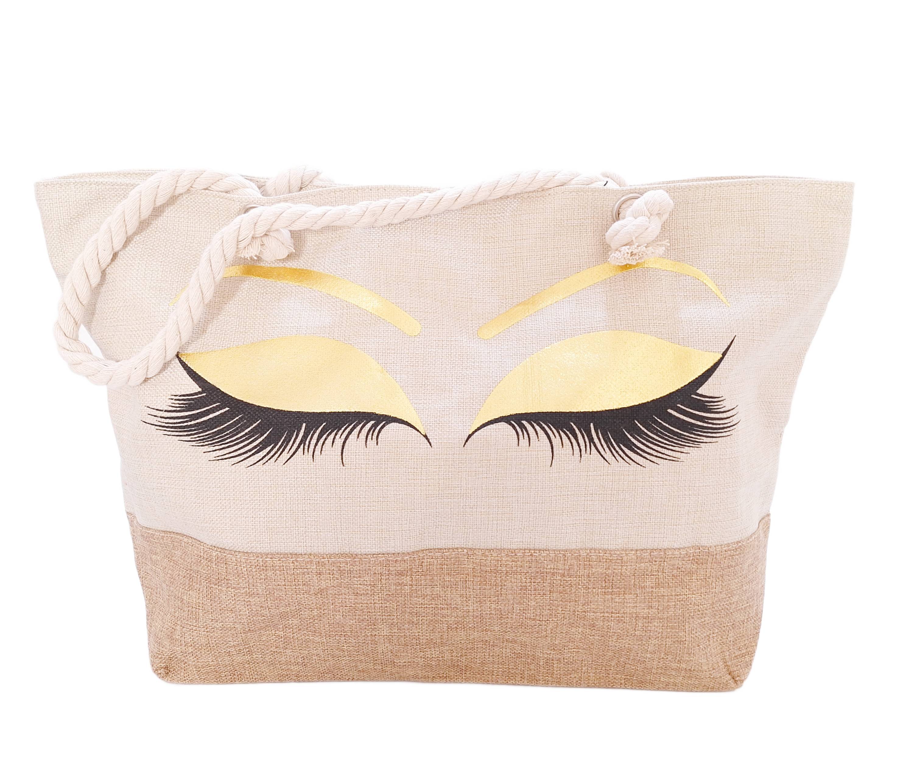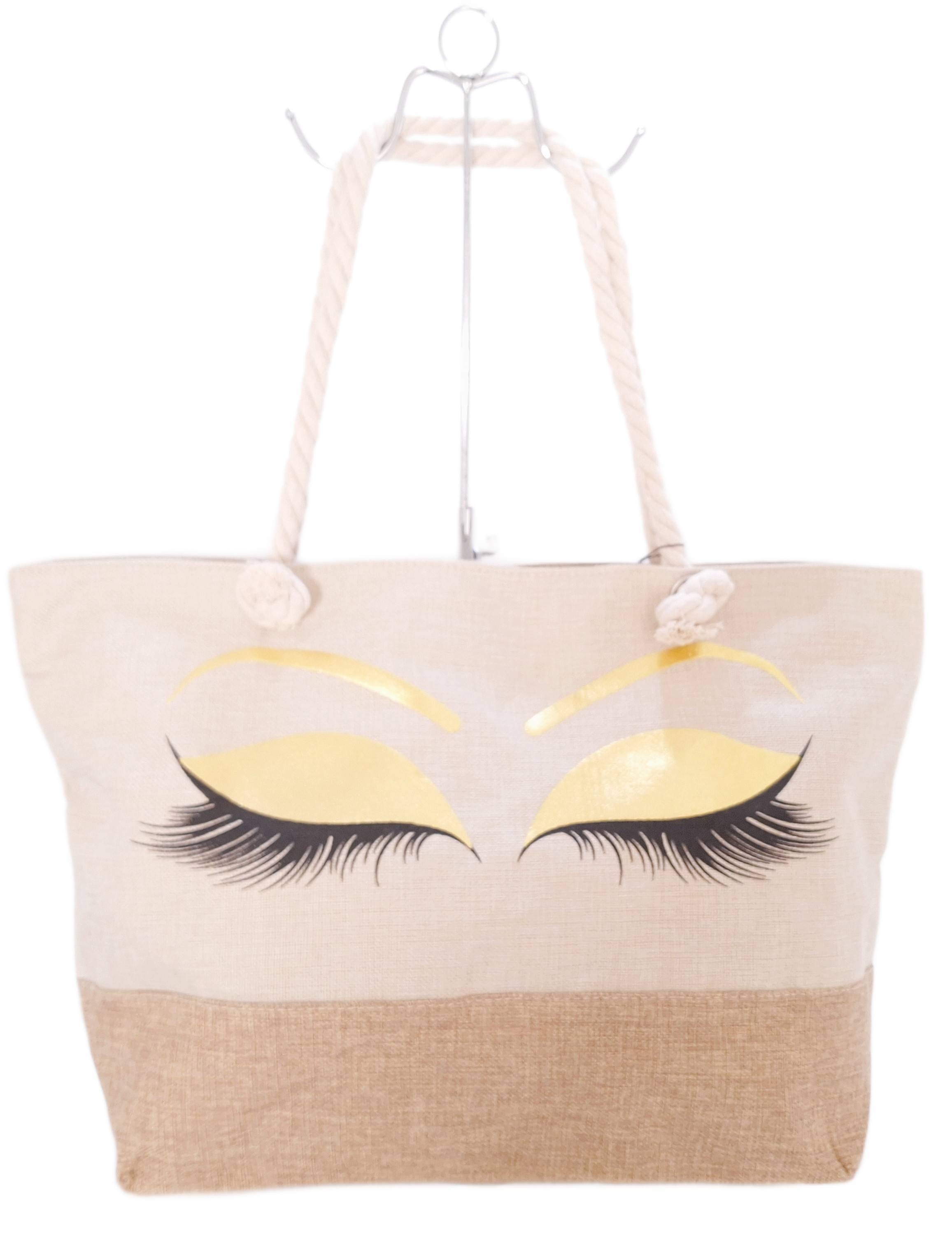 Plażowa shopper bag marki Bagia to połączenie stylowego designu, funkcjonalności i letniego klimatu. Torba wykonana z materiału imitującego jutowy worek w naturalnym, beżowym kolorze. Na froncie torby uwagę przyciąga stylowa grafika- złote powieki i długie rzęsy. Wyposażona w jedną komorę zamykana na zamek błyskawiczny. Wnętrze zabezpiecza podszewka z poliestru. Bez problemu zmieści format A4, dzięki czemu sprawdzi się również jako shopperka na co dzień. Dwie grube rączki ze skręcanego sznurka w marynarskim stylu to nie tylko modny akcent, ale też gwarancja wygody – torbę możesz nosić zarówno w ręku, jak i na ramieniu.